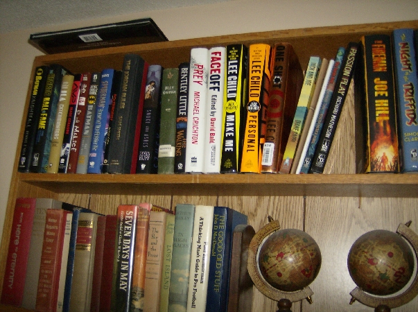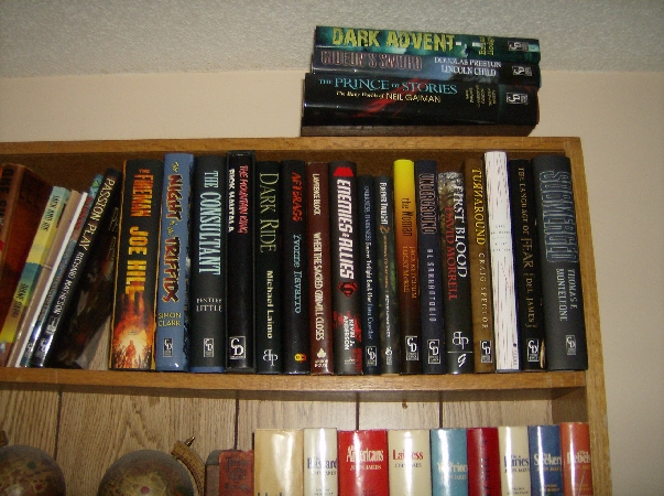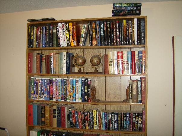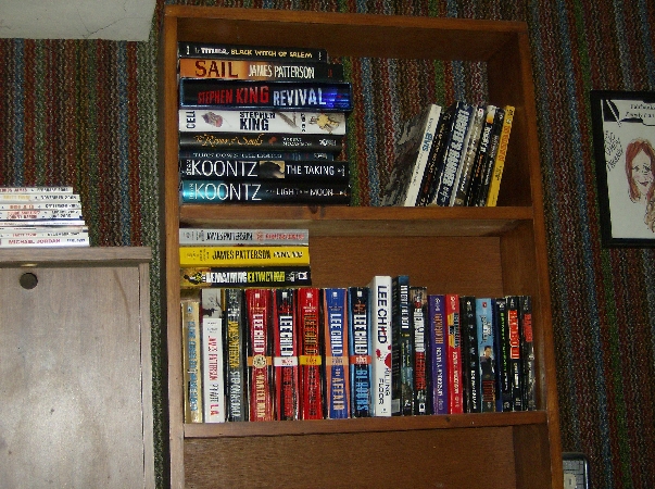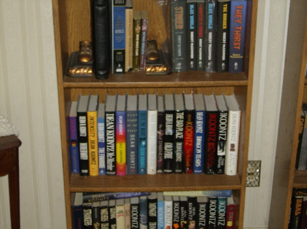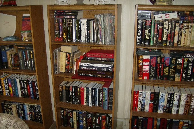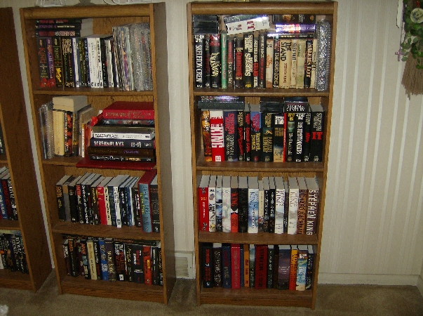 Shelving method (by genre, author, signed copies): I shelve by author, generally. As you can see from the pictures I have a large collection of Stephen King as well as a sizable number of Robert R. McCammon and Dean Koontz books.