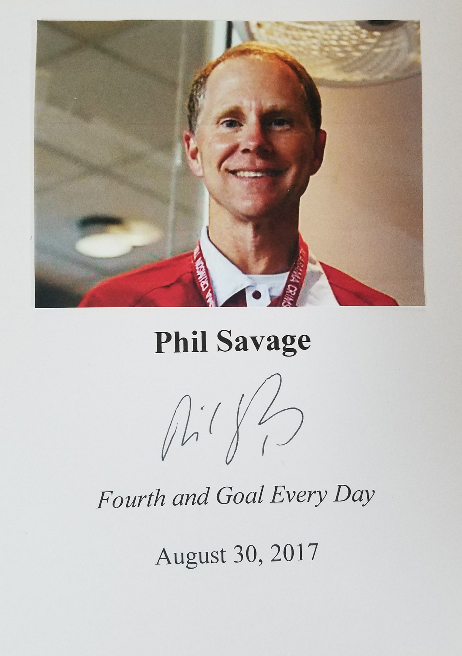PHIL SAVAGE (pictured below from our Wall of Fame) might be the premiere football mind in America. He has certainly had more experiences as a player, coach and administrator. His relationship with Nick Saban goes back to when he assisted Coach Saban with defensive backs at Cleveland, through his service as General Manager of the Browns, to color broadcast for Bama games and CEO of the Senior Bowl. Possibly his greatest contribution is the scouting report he emails Coach Saban prior to every game. His record as of publication of this book, since he began scouting Alabama's opponents, the Crimson Tide has won 100 and lost 11. Thank you Phil Savage for signing our books.