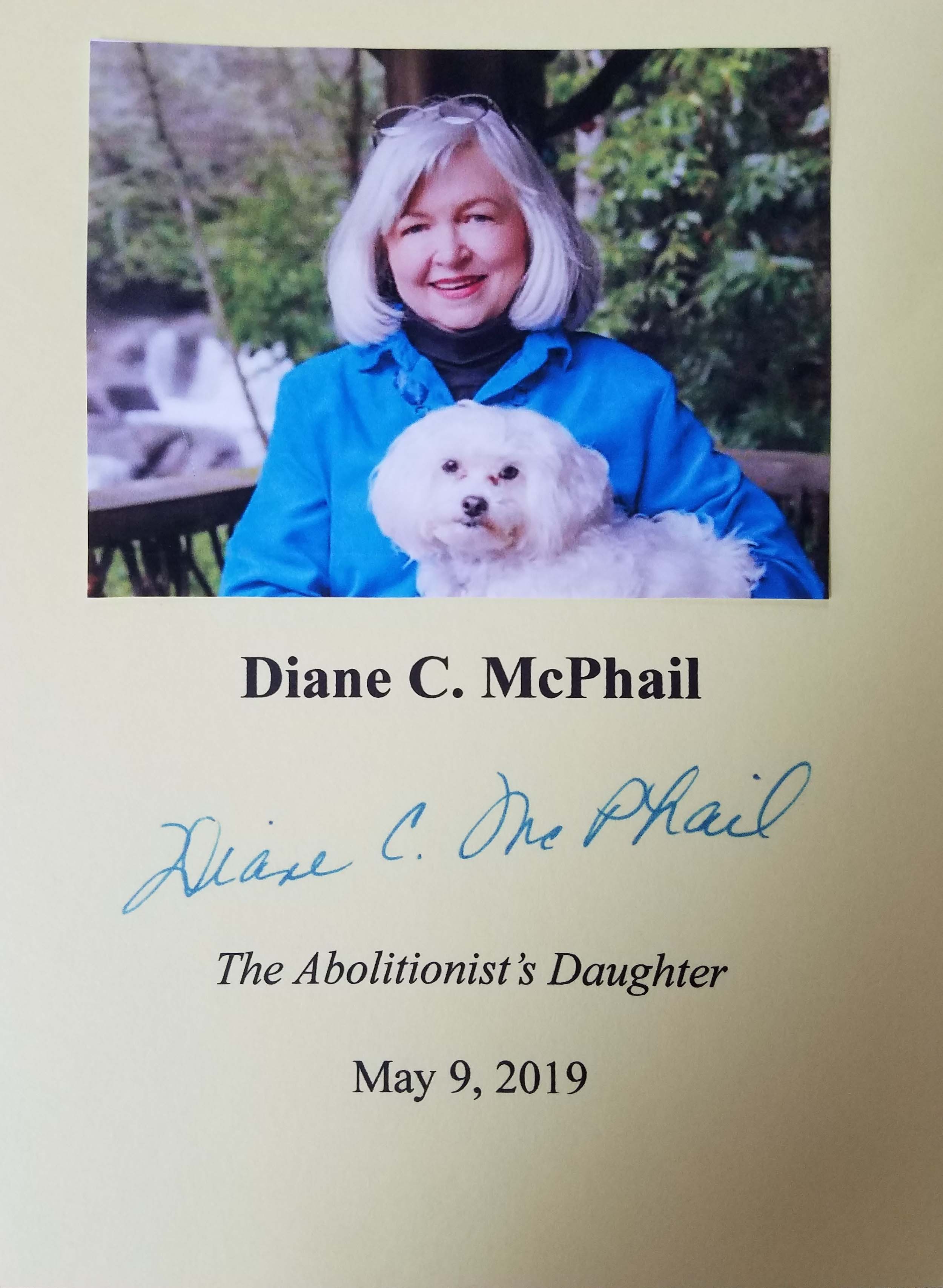 DIANE C. MCPHAIL (pictured below from our Wall of Fame) is an artist, writer, and minster from North Carolina. She has attended writing programs at Ole Miss, Duke, the University of Iowa, and Yale. This is her first major novel. Thank you Diane McPhail for signing our books.