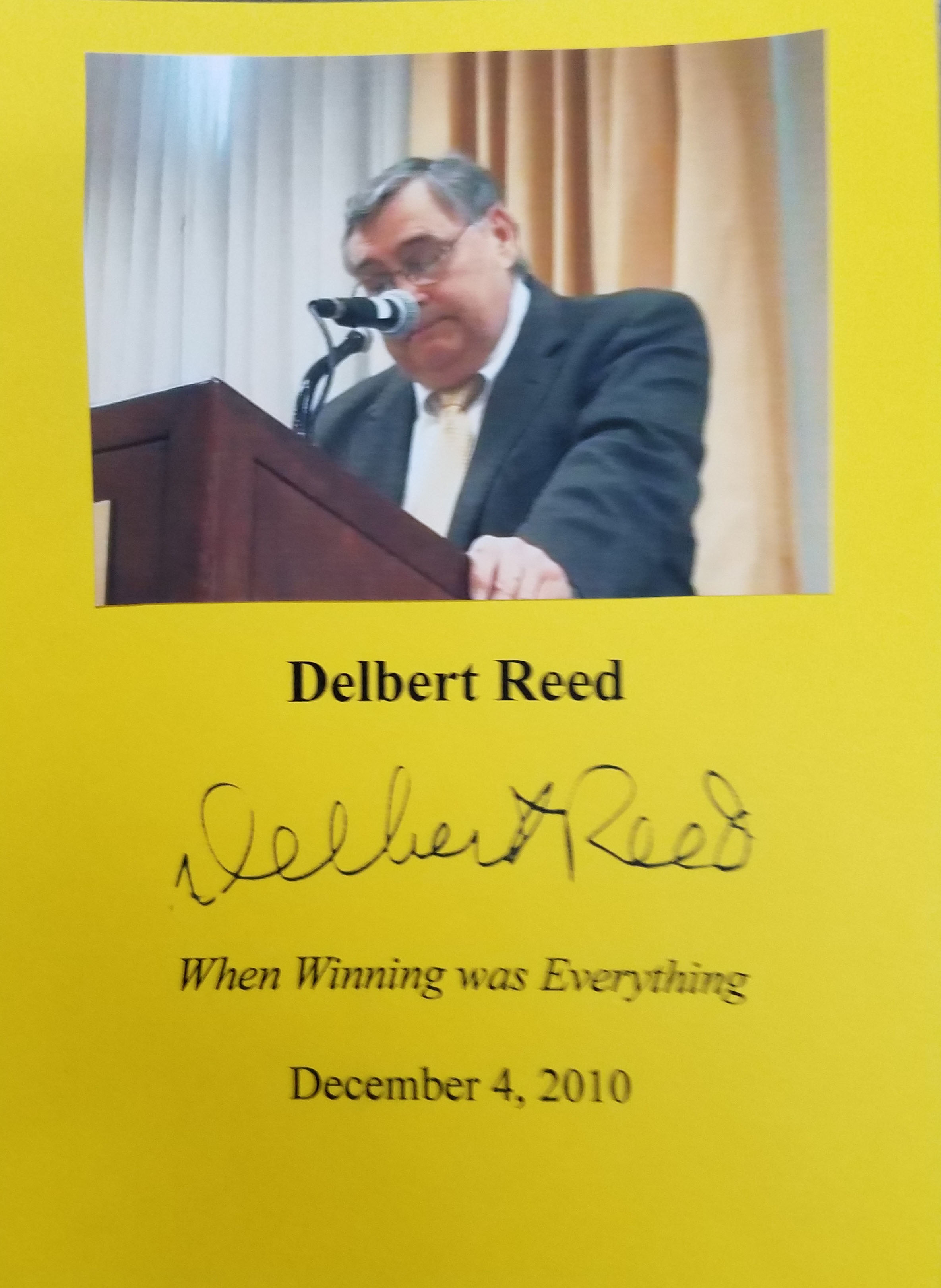 DELBERT REED (shown below from our Wall of Fame) was writer-in-residence at the Paul W. Bryant Museum at the University of Alabama for more than three years and is an award-winning journalist and author of Paul "Bear" Bryant: What Made Him a Winner. Thank you Delbert Reed for signing our books.