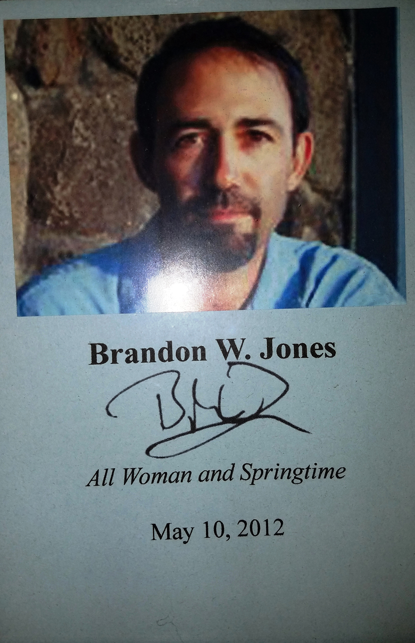 BRANDON W. JONES (pictured below from our Wall of Fame) is one of the most interesting authors in our collection. He is an artist, musician, inventor, sculptor, and no telling what since this posting. He lives in Hawaii. Thank you Brandon Jones for signing our books.