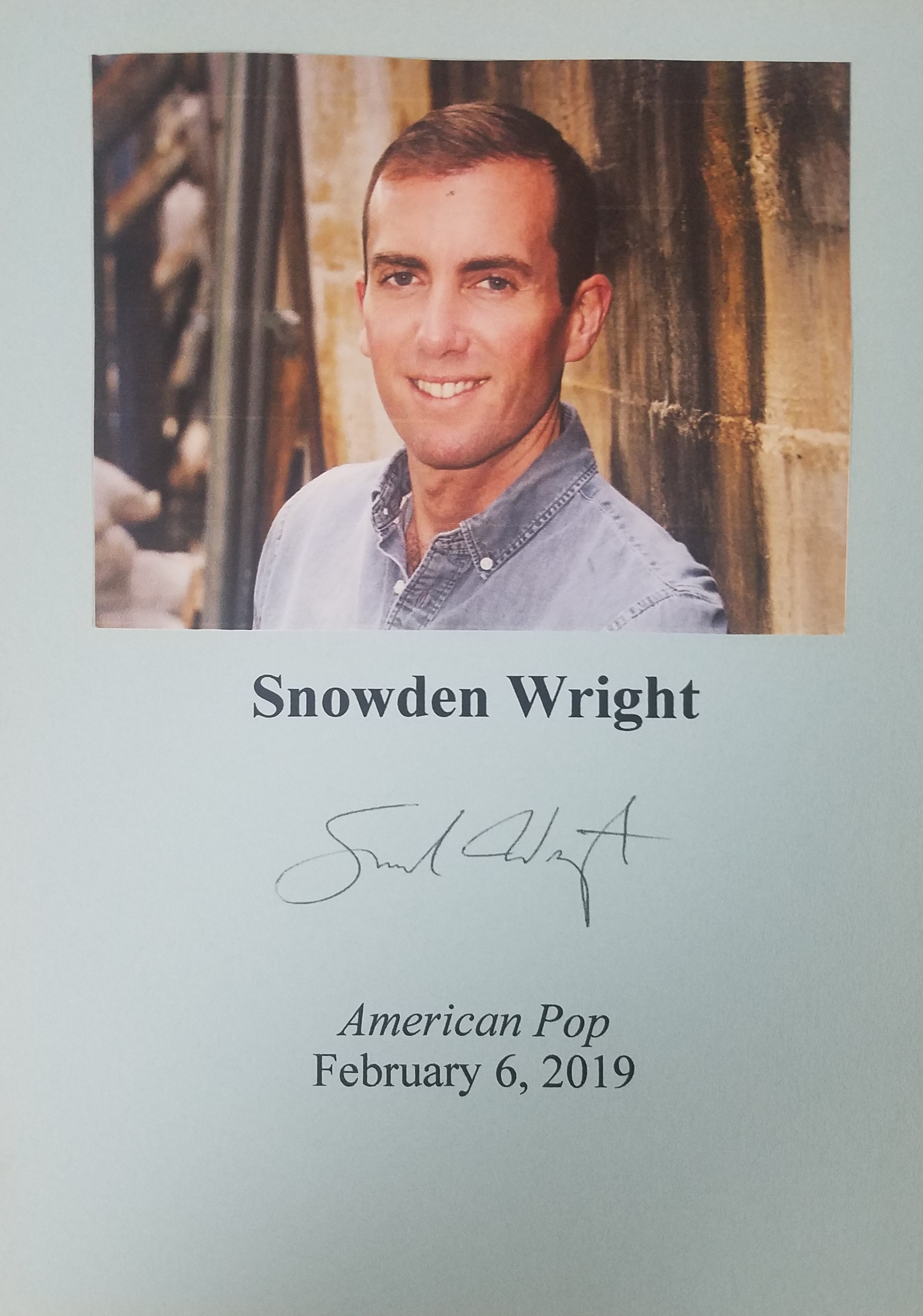 SNOWDEN WRIGHT (shown below from our Wall of Fame) is considered one of the South's finest young writers from whom we expect many more great works. He has previously worked as a fiction writer for The New Yorker, The Paris Review, and Esquire, and is a graduate of both Harvard and Columbia. Thank you Snowden Wright for signing our books.