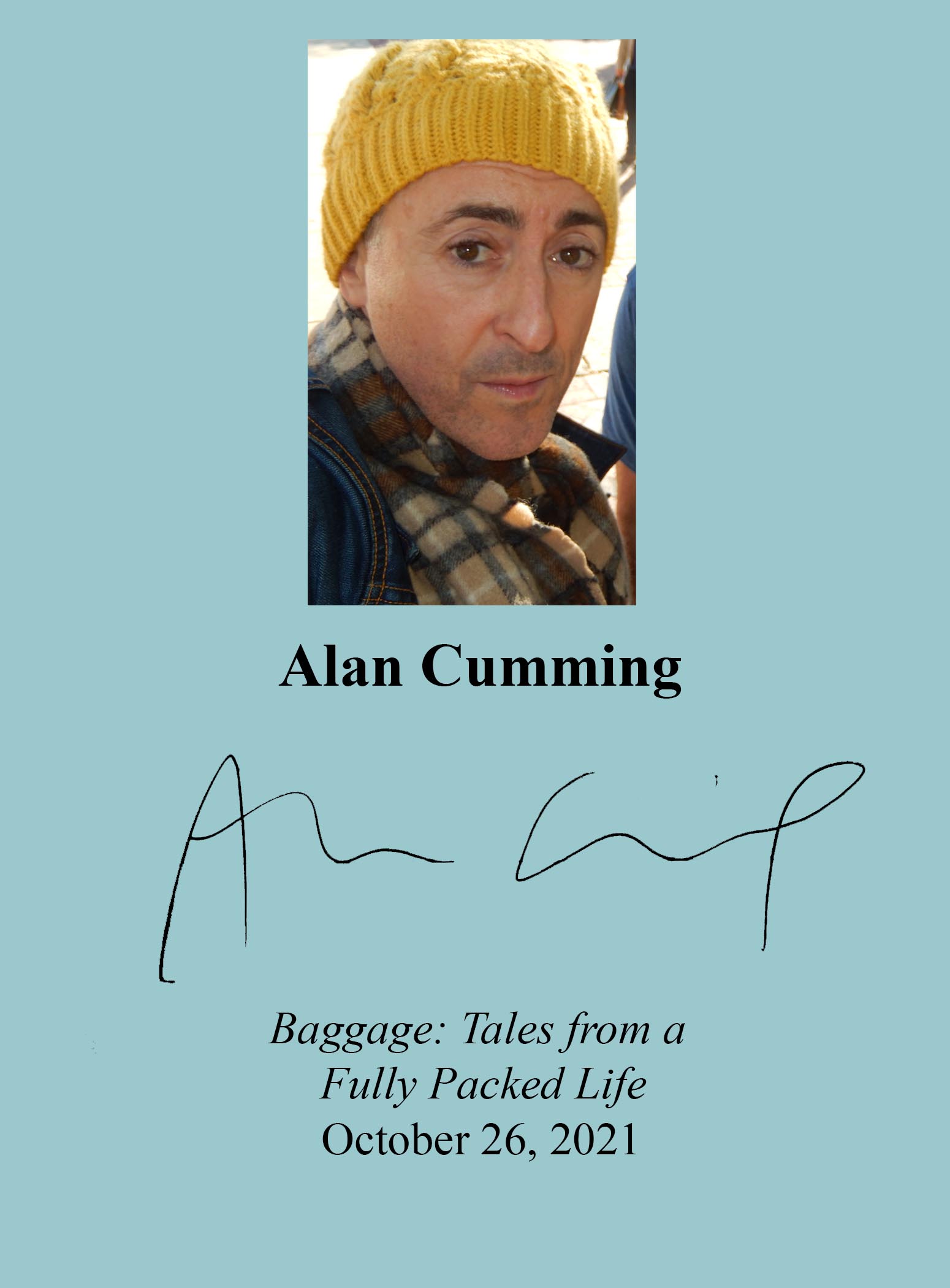 THIS COPY (shown below) was hand signed by Alan Cumming on a page bound into the book. It is a new, unread, unopened first edition and comes with a certificate authenticating the signature. Published in October 2021 by Dey Street, and imprint of William Morrow, a HarperCollins company.
