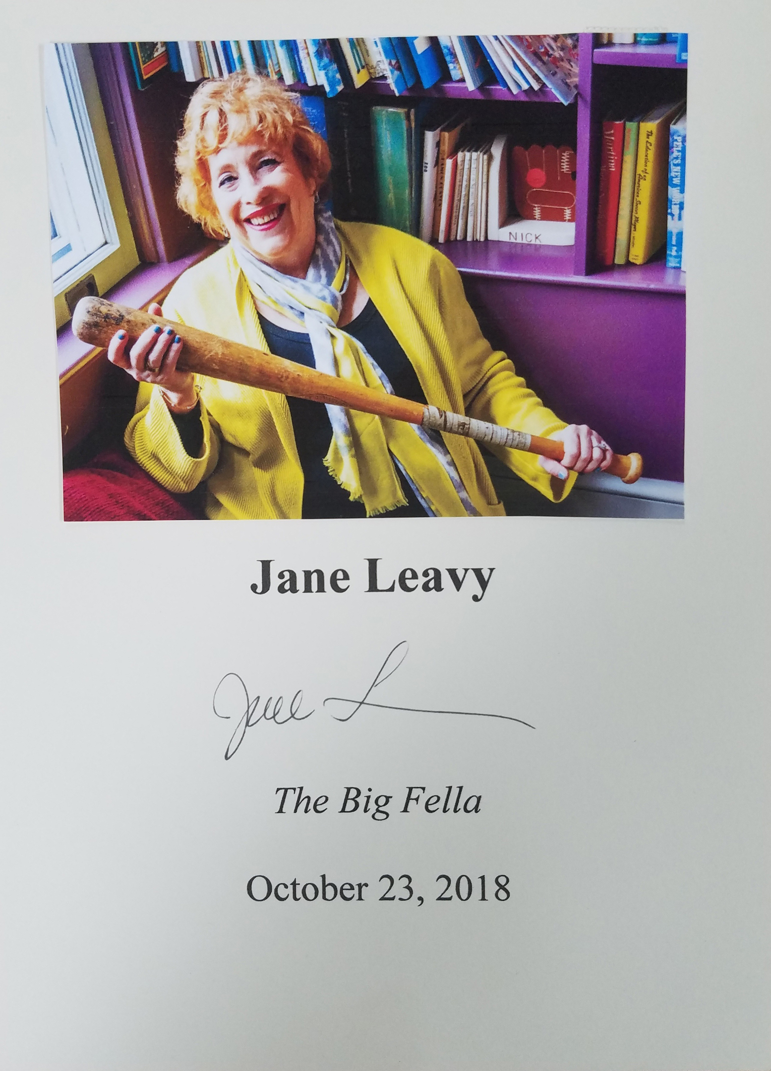JANE LEAVY (shown here from our Wall of Fame) is an award winning author and sportswriter who has written best-selling biographies of Mickey Mantle and Sandy Koufax, as well as the novel Squeeze Play, which Entertainment Weekly called "the best novel ever written about baseball." Thank you Jane Leavy for signing our books.