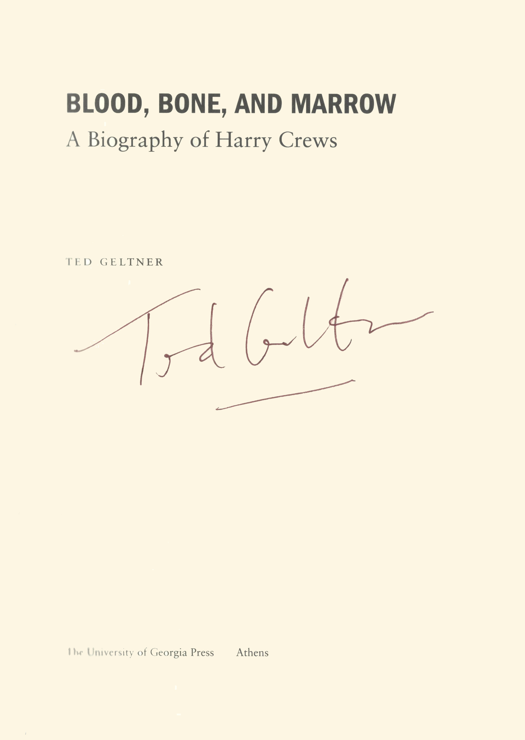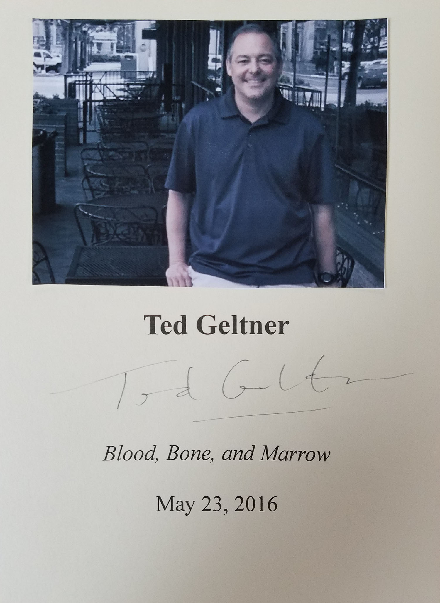 TED GELTNER (pictured below from our Wall of Fame) is a college professor who formerly worked on newspapers in Florida and Pennsylvania. Blood, Bone, and Marrow: A Biography of Harry Crews is his second book. Thank you Ted Geltner for signing our books.