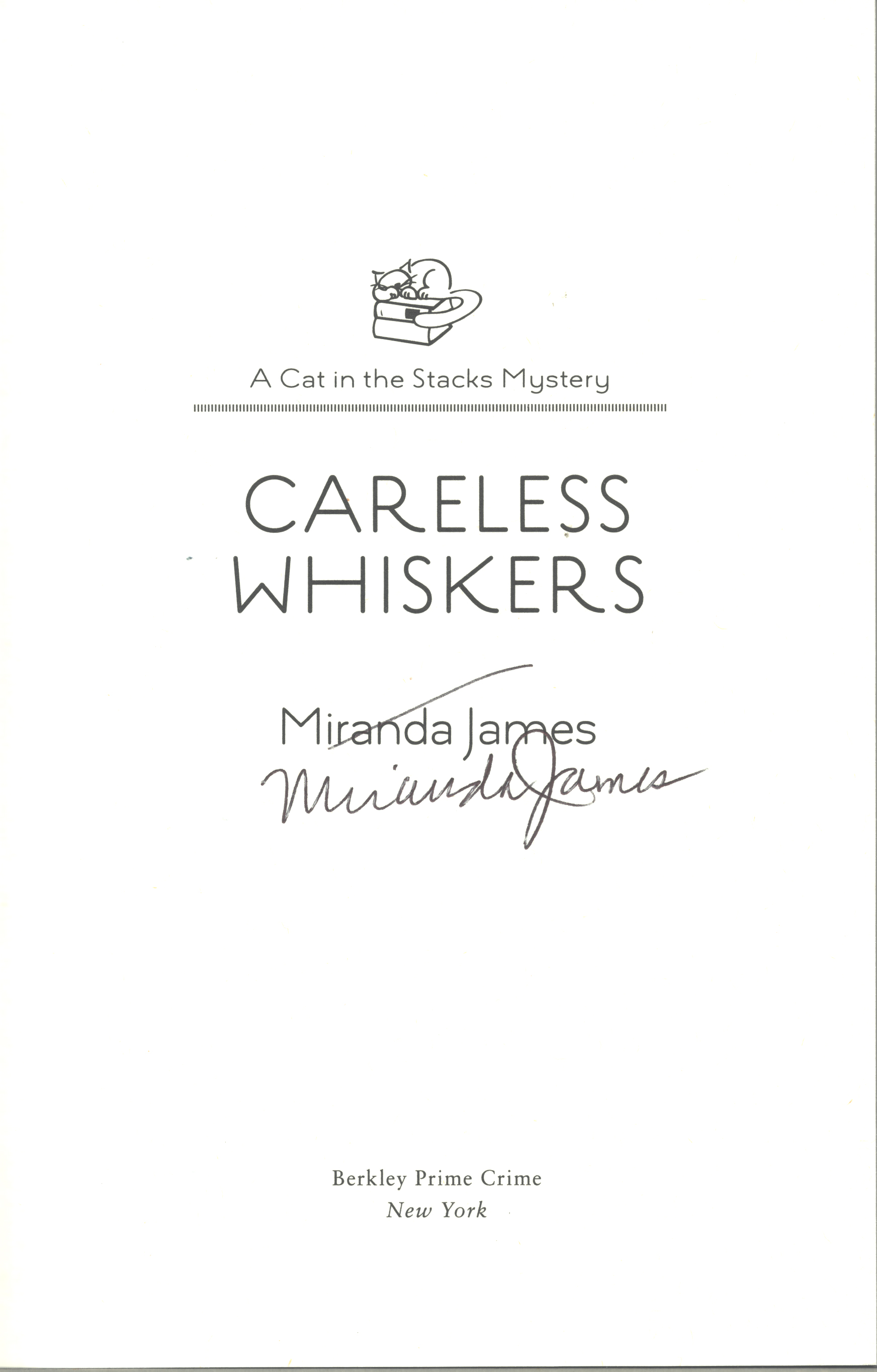 THIS COPY (shown below) was hand signed by Miranda James on the title page at the store. It is a new, unread first edition opened only for signing and comes with a certificate authenticating the signature. Published in January, 2020 by Berkley, an imprint of Penguin Random House.
