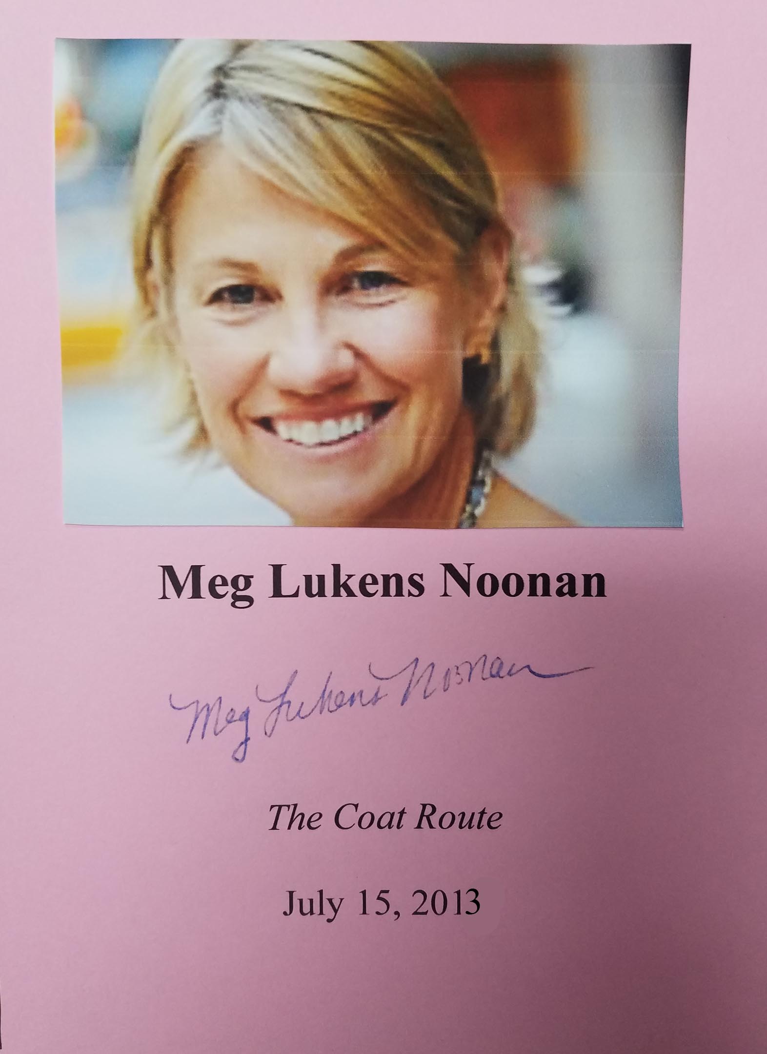 MEG NOONAN (pictured below from our Wall of Fame) is a former correspondent who has written for most of the country's important magazines. This is her first book. Thank yoU Meg Noonan for signing our books.