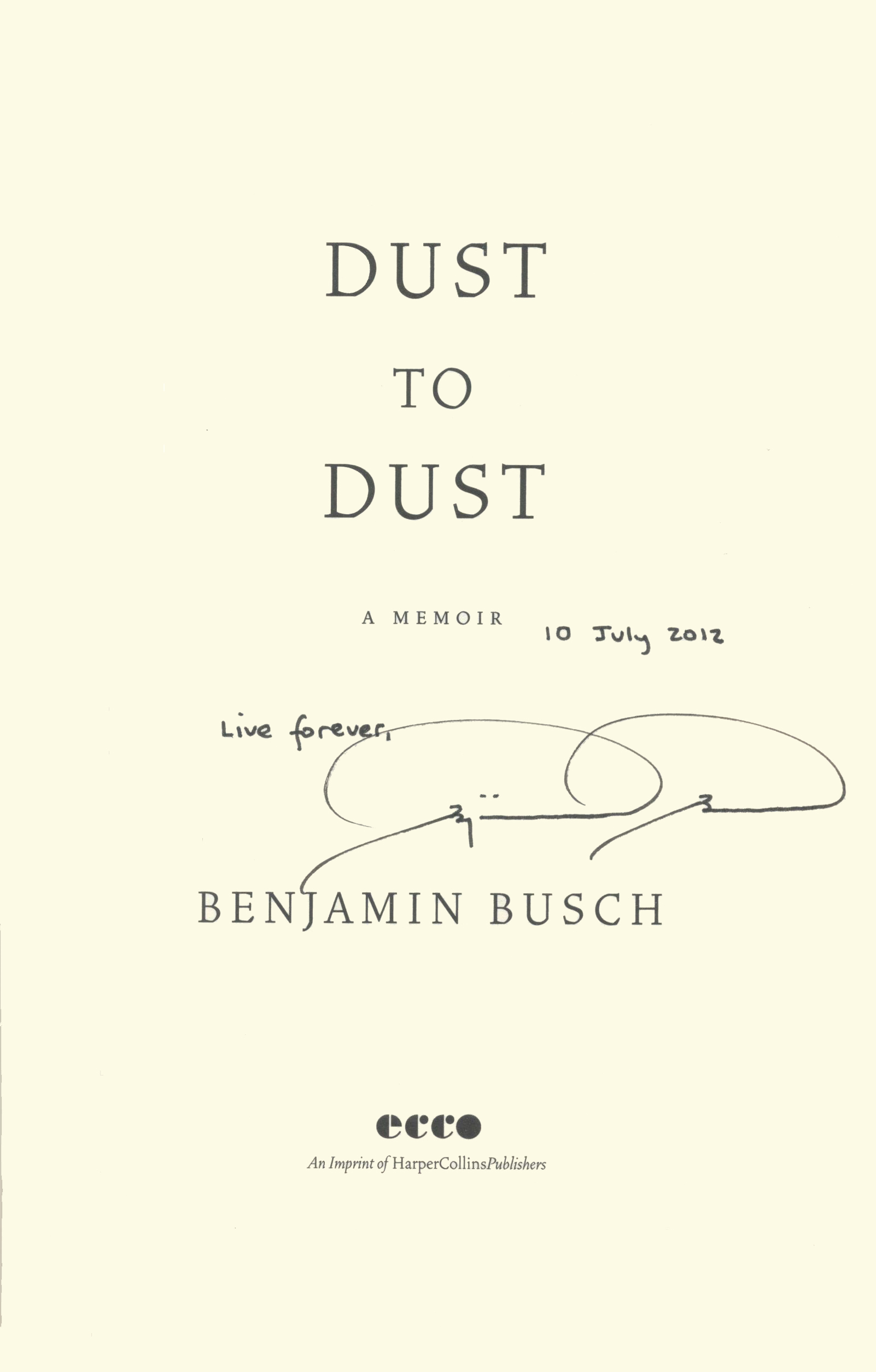 THIS COPY (shown below) was hand signed by Benjamin Busch on the title page at the store. It is a new, unread first edition opened only for signing and comes with a certificate authenticating the signature. Published in March, 2012 by Ecco, an imprint of Harpercollins.