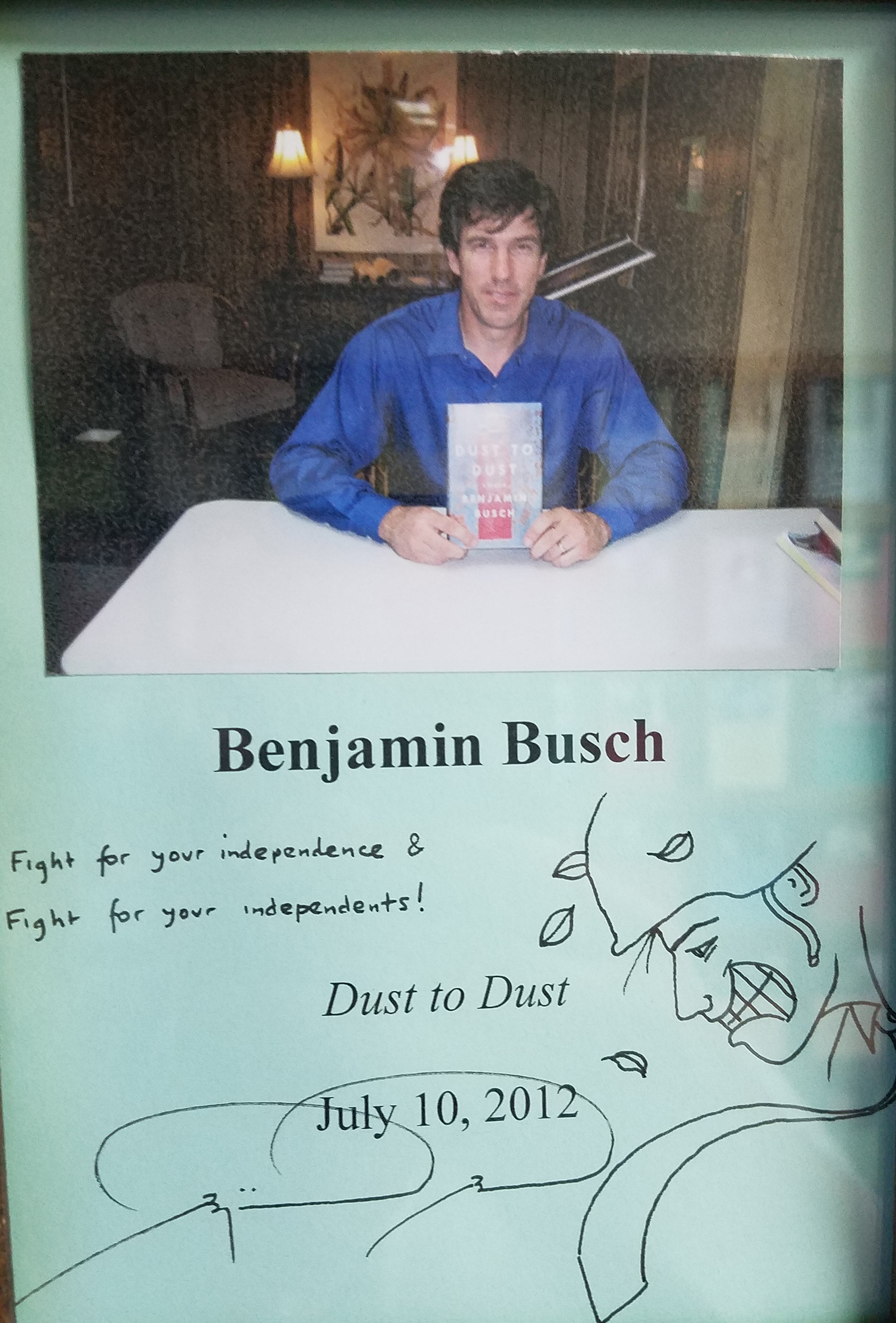BENJAMIN BUSCH (pictured below from our Wall of Fame) is an award-winning writer, actor, director, a U.S. Marine who served two combat tours of duty in Iraq, and was a commentator on NPR. Thank you Benjamin Busch for signing our books.