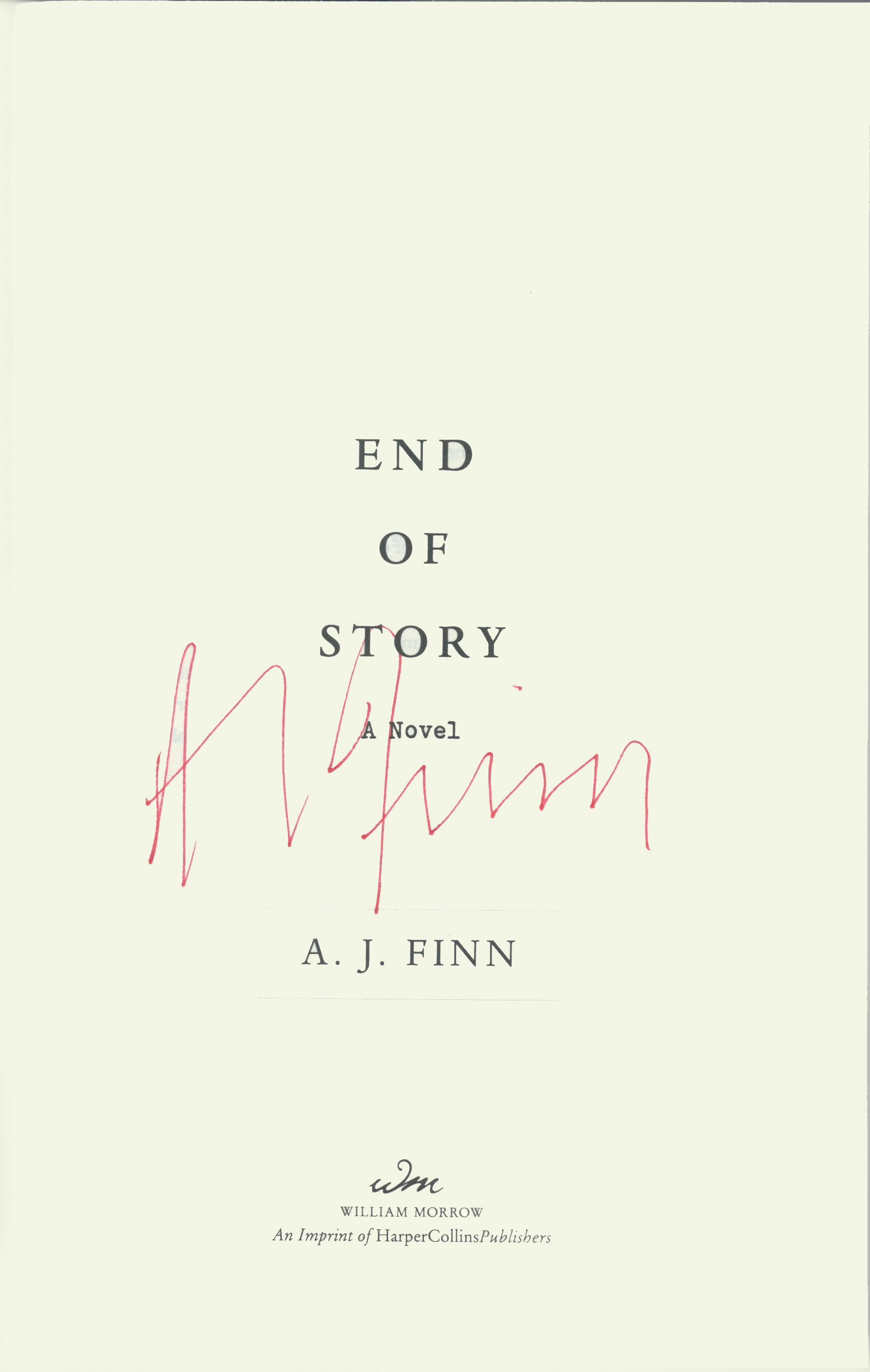 THIS COPY (shown below) was hand signed by A.J. Finn on the title page. It is a new, unread, unopened first edition and comes with a certificate authenticating the signature. Published in February, 2024 by William Morrow, an imprint of HarperCollins.