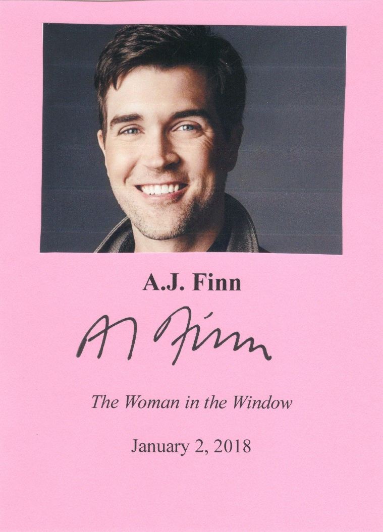 A.J. FINN (pictured below from our Wall of Fame) is a global phenomenon whose books have been translated into forty languages. Thank you A.J. Finn for signing our books.