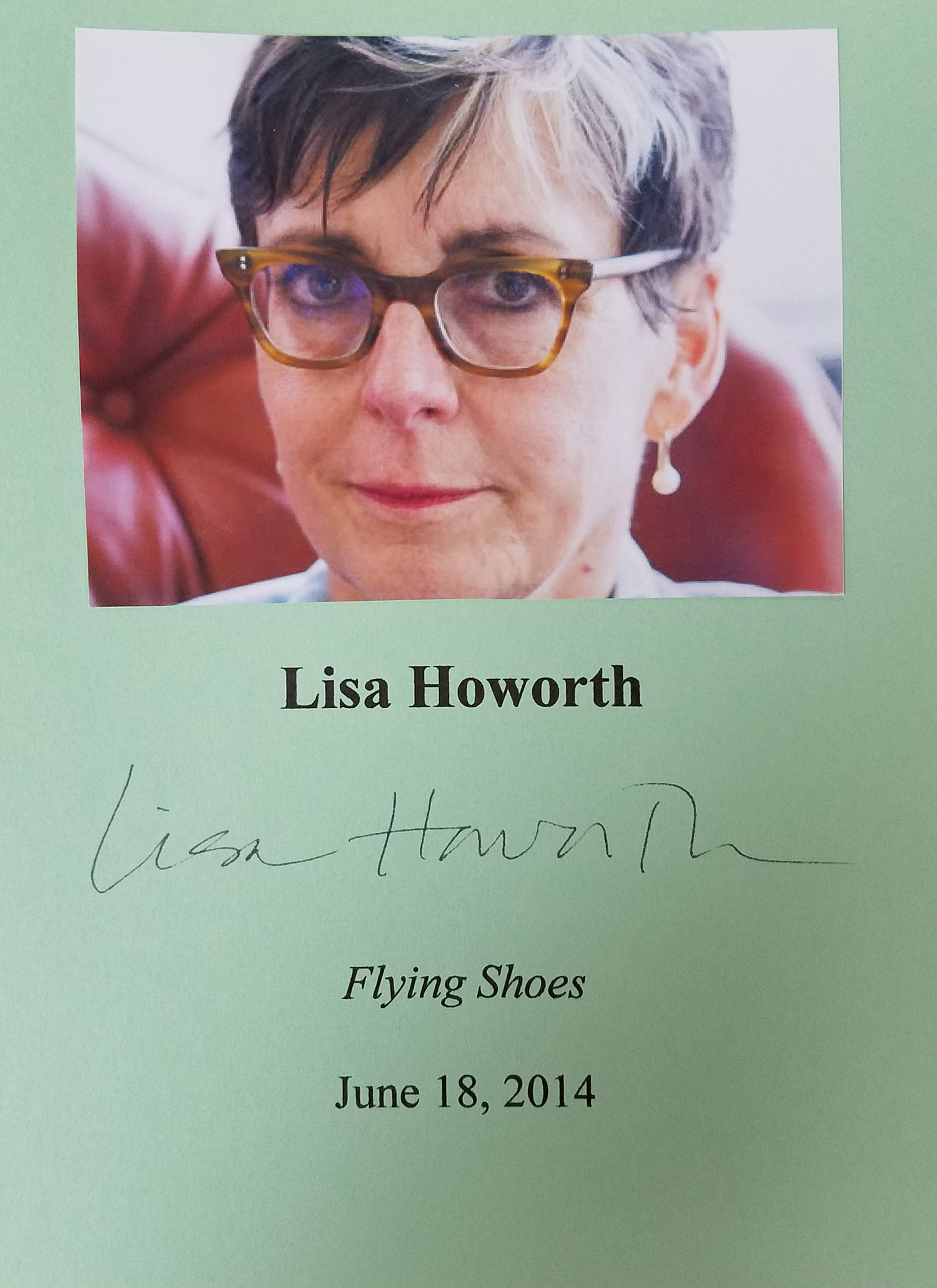 LISA HOWORTH (pictured below from our Wall of Fame) is co-founder and co-owner, along with her husband Richard, of one of the great bookstores of the world, Square Books in Oxford, Mississippi. Although she has been writing for decades and won the Governor's Award for Excellence in the Arts, Flying Shoes is her first novel. Thank you Lisa Howorth for signing our books.