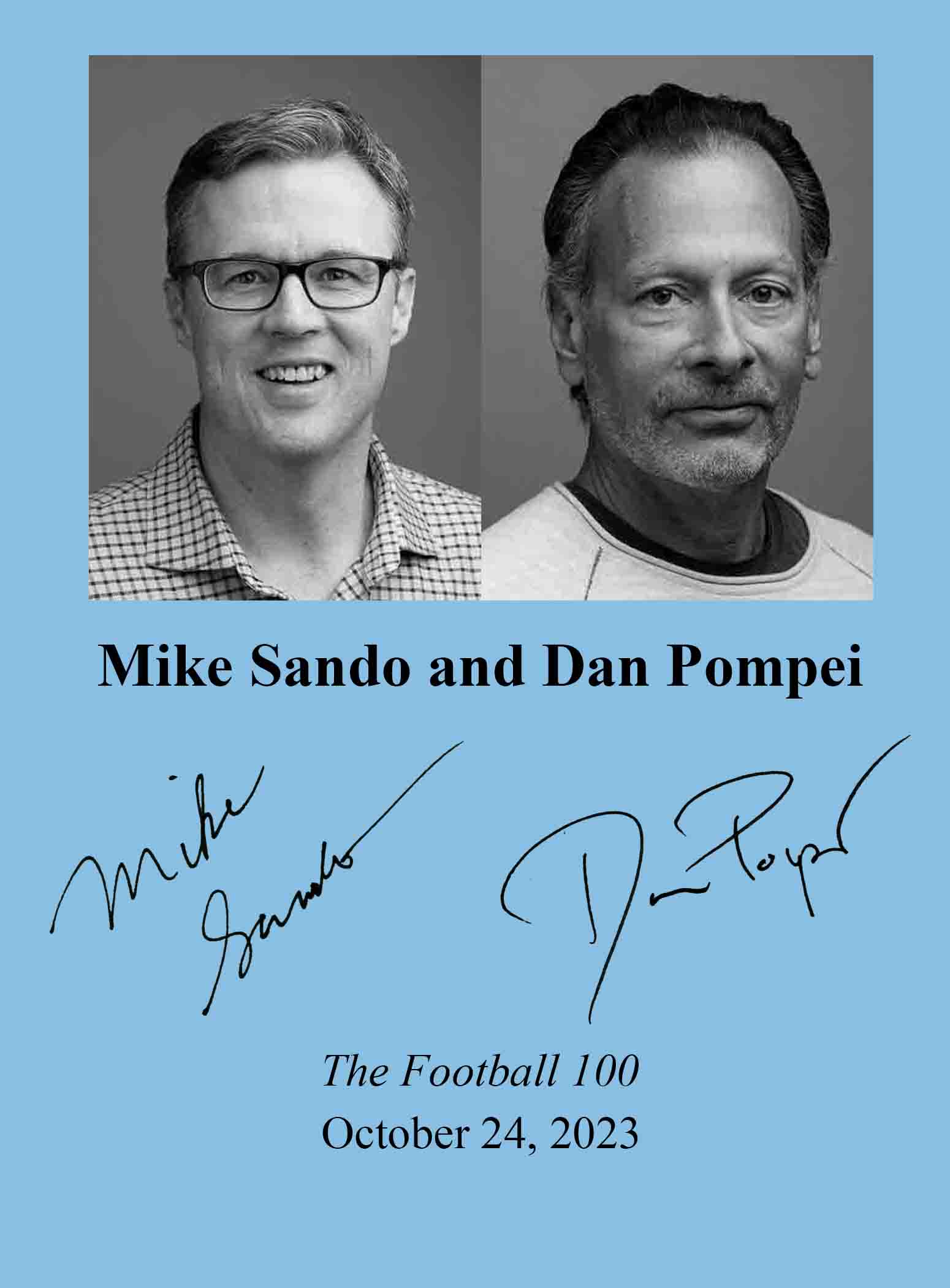 MIKE SANDO AND DAN POMPEI (pictured below on our Wall of Fame) serve as selectors for the Pro Football Hall of Fame. They hold a place of honor among The Pro Football Writers of America and are the lead scribes for The Athletic for the sport. Thank you Mike Sando and Dan Pompei for signing our books.