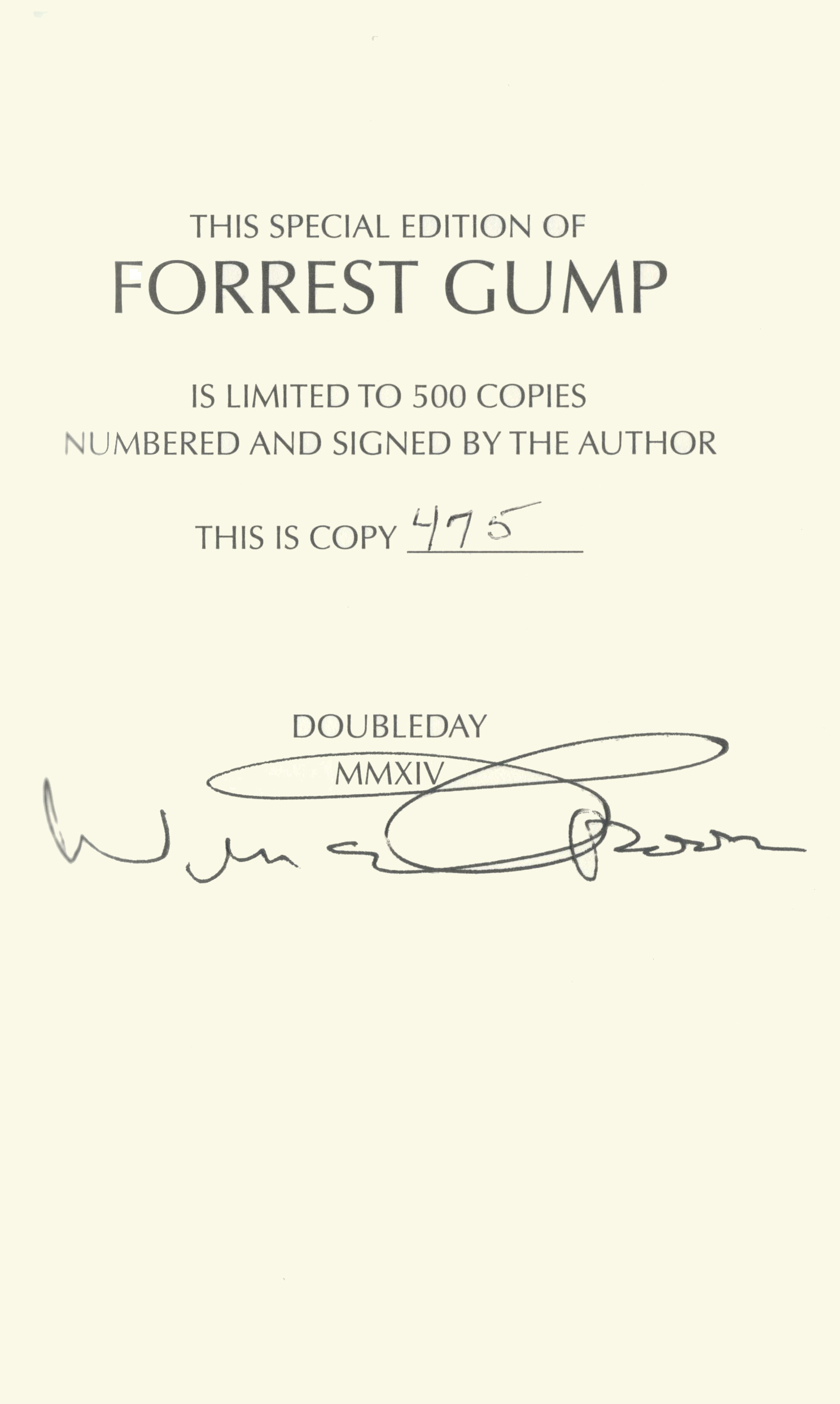THIS COPY (shown below) was hand signed by Winston Groom on the limited edition page in Birmingham. Hardbacks of this classic have been out of print for almost two decades until we brought it back in partnership with the publisher and our friends at Page and Palette. It is a new, unread slipcase limited edition, opened only for signing and comes with a certificate authenticating the signature. Published for the Alabama Booksmith in September, 2014 by Doubleday, an imprint of Penguin Random House.