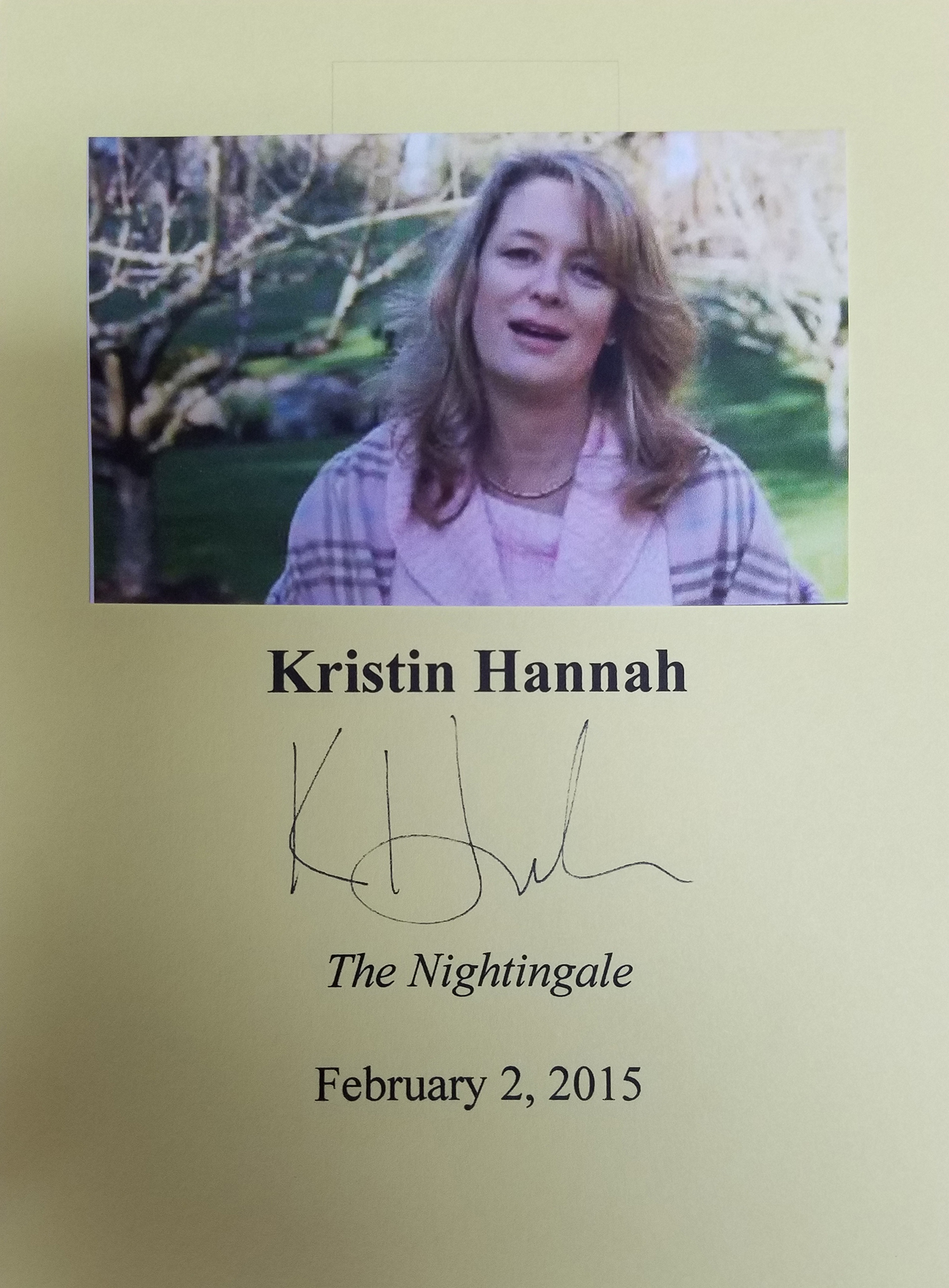 KRISTIN HANNAH (pictured below from our Wall of Fame) is a former lawyer who has written more than twenty novels that have been translated into thirty-nine languages. She has a bundle of awards. Thank you Kristin Hannah for signing our books.