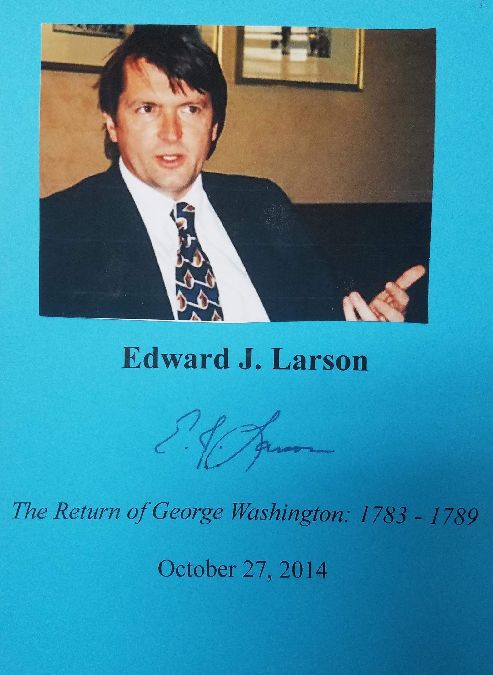 EDWARD J. LARSON (pictured below from our Wall of Fame) is an inaugural fellow at the National Library for the Study of George Washington, and is a professor of history and chair of the school of law at Pepperdine University. His book Summer for the Gods won the Pulitzer Prize for history in 1998. Thank you Edward Larson for signing our books.