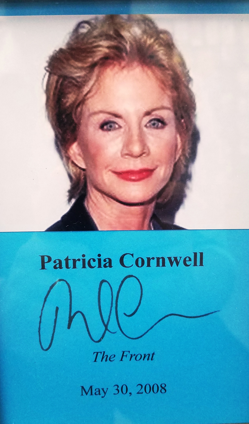 PATRICIA CORNWELL (pictured below from our Wall of Fame) invented the forensic thriller, and has now sold more than one hundred million copies, translated into 36 languages, and available in more than one hundred and twenty countries. She has won every writing award offered in the mystery/thriller genre. Young writers can take heart from her anecdote she shares that her first book signing didn't sell a single copy, and yielded one question. An elderly lady asked, "Where are the cookbooks." Thank you Patricia Cornwell for signing our books.