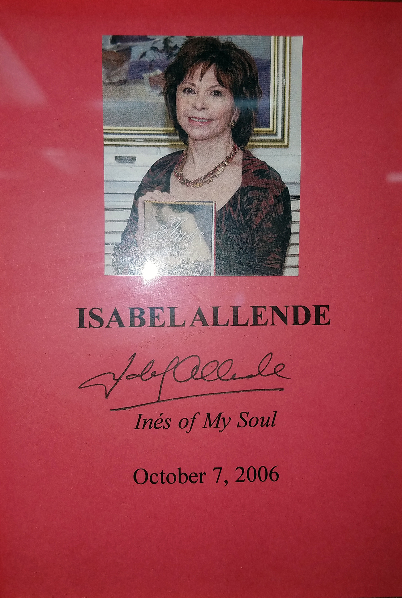 ISABEL ALLENDE (pictured below from our Wall of Fame) has been kind enough to sign her last several titles for our customers. Born in Peru and raised in Chile, she is one of the world's most respected writers. Her titles have been translated into thirty-five languages and have sold more than sixty-five million copies. Thank you Isabel Allende for signing our books.