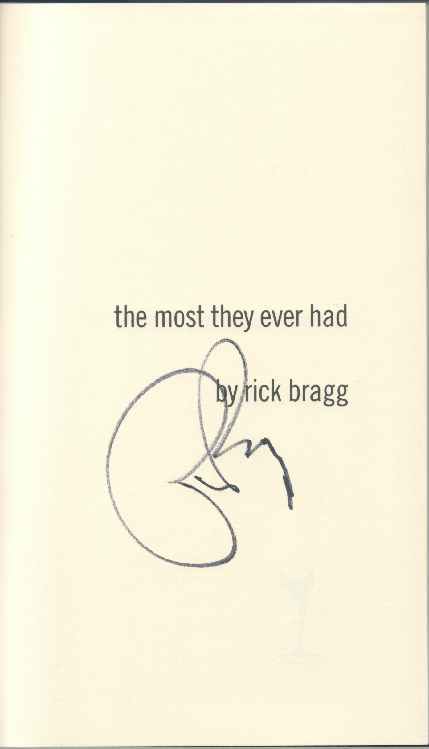 THIS COPY (shown below) was hand signed by Rick Bragg at the store on the half-title page. It is a new, unread first edition opened only for signing and comes with a certificate authenticating the signature. Published by MacAam/Cage in November 2009.