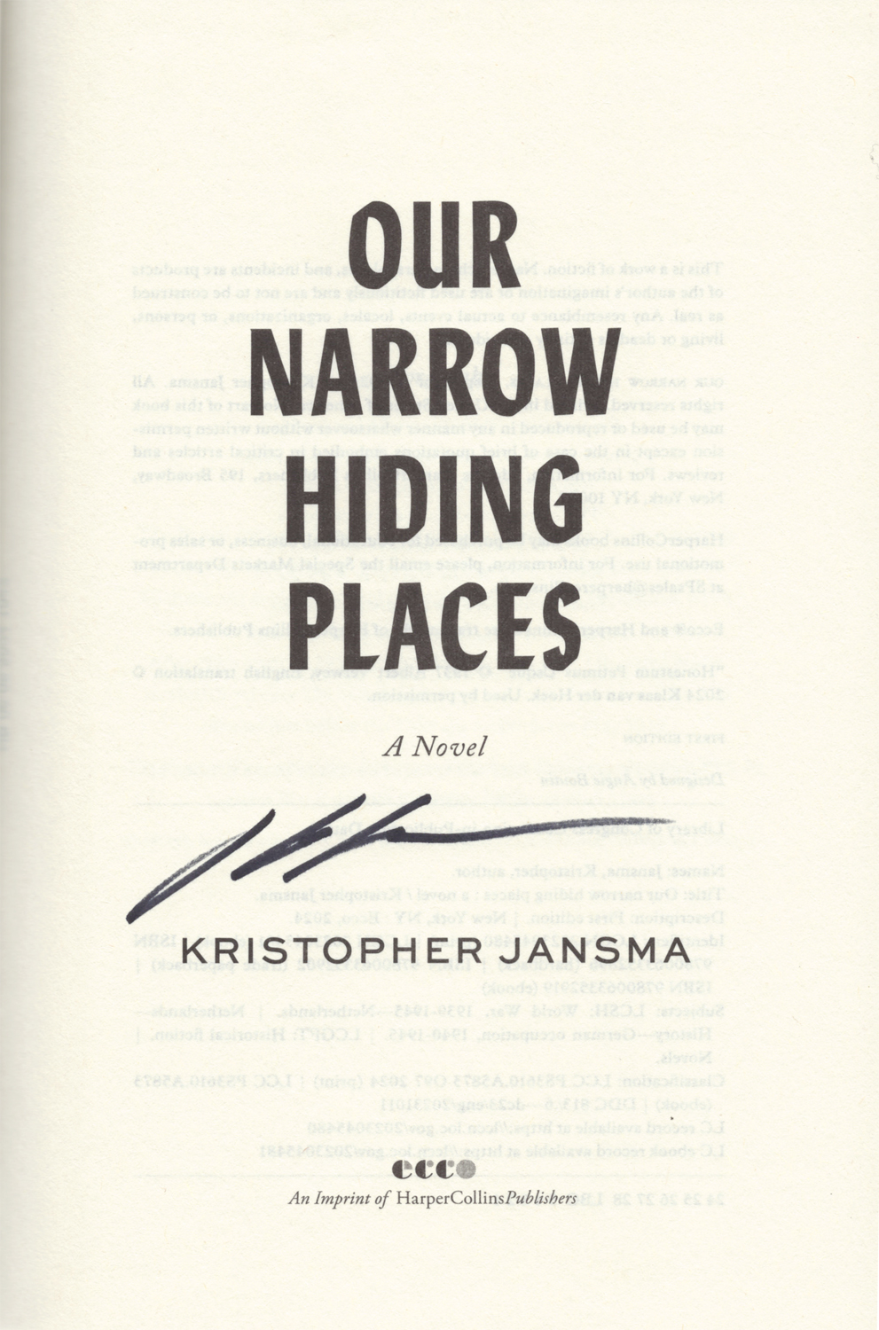 THIS COPY (Shown below) was hand signed by Kristopher Jansma on the title page. It is a new, unread, hardback first edition opened only for signing and comes with a certificate authenticating the signature. Published in August, 2024 by Ecco Press, an imprint of Harpercollins Publishers.