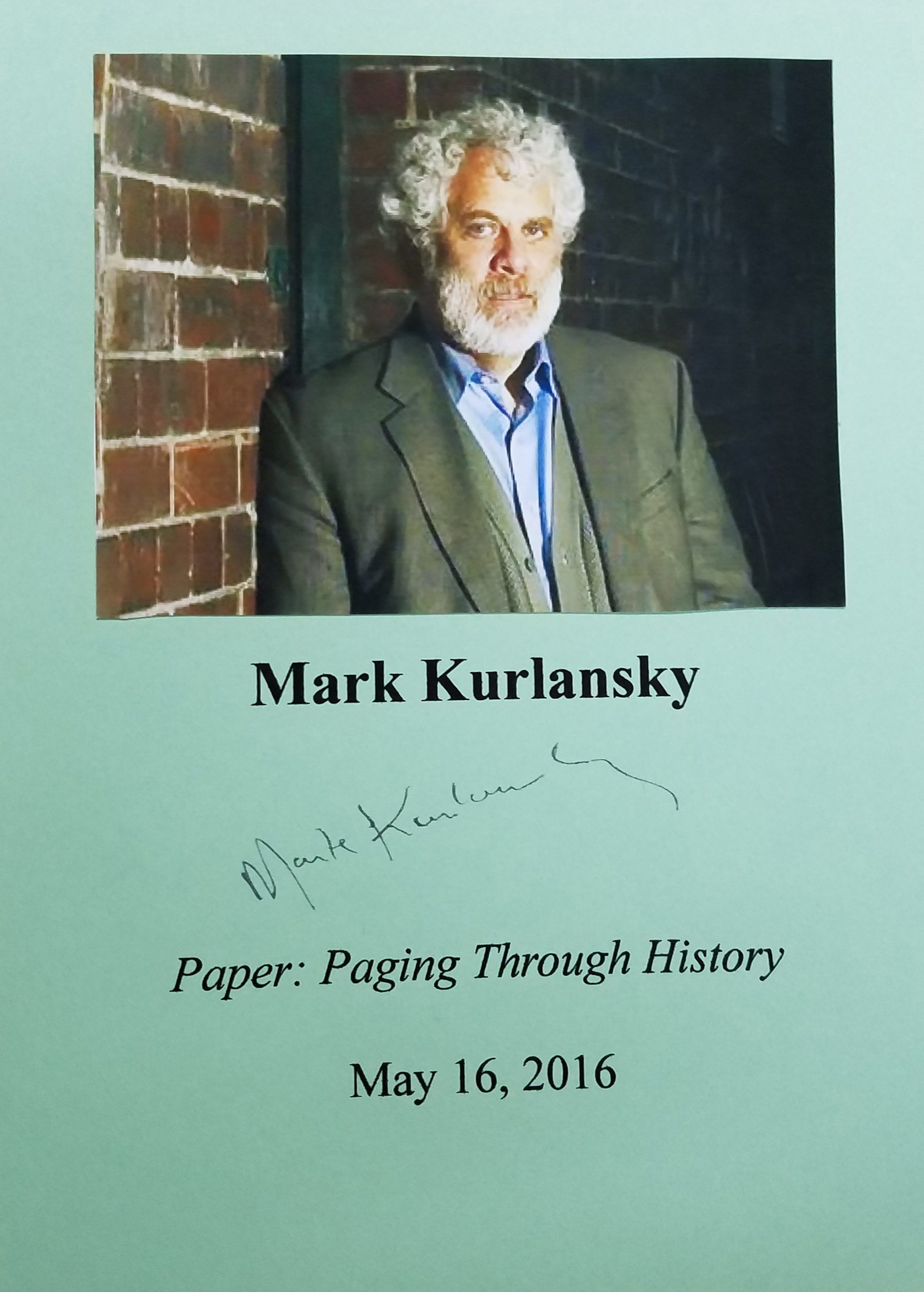 MARK KURLANSKY (pictured below from our Wall of Fame) is an international best-seller whose books have been translated into twenty-five languages. He has published fiction and children's books, and is a playwright, but is best known for his wide ranging works of non-fiction. His background as a journalist covering Central and Latin America, Europe, Asia and Africa served him well in researching an amazing collection of genres such as food, sports and history in minute detail. Thank you Mark Kurlansky for signing our books.