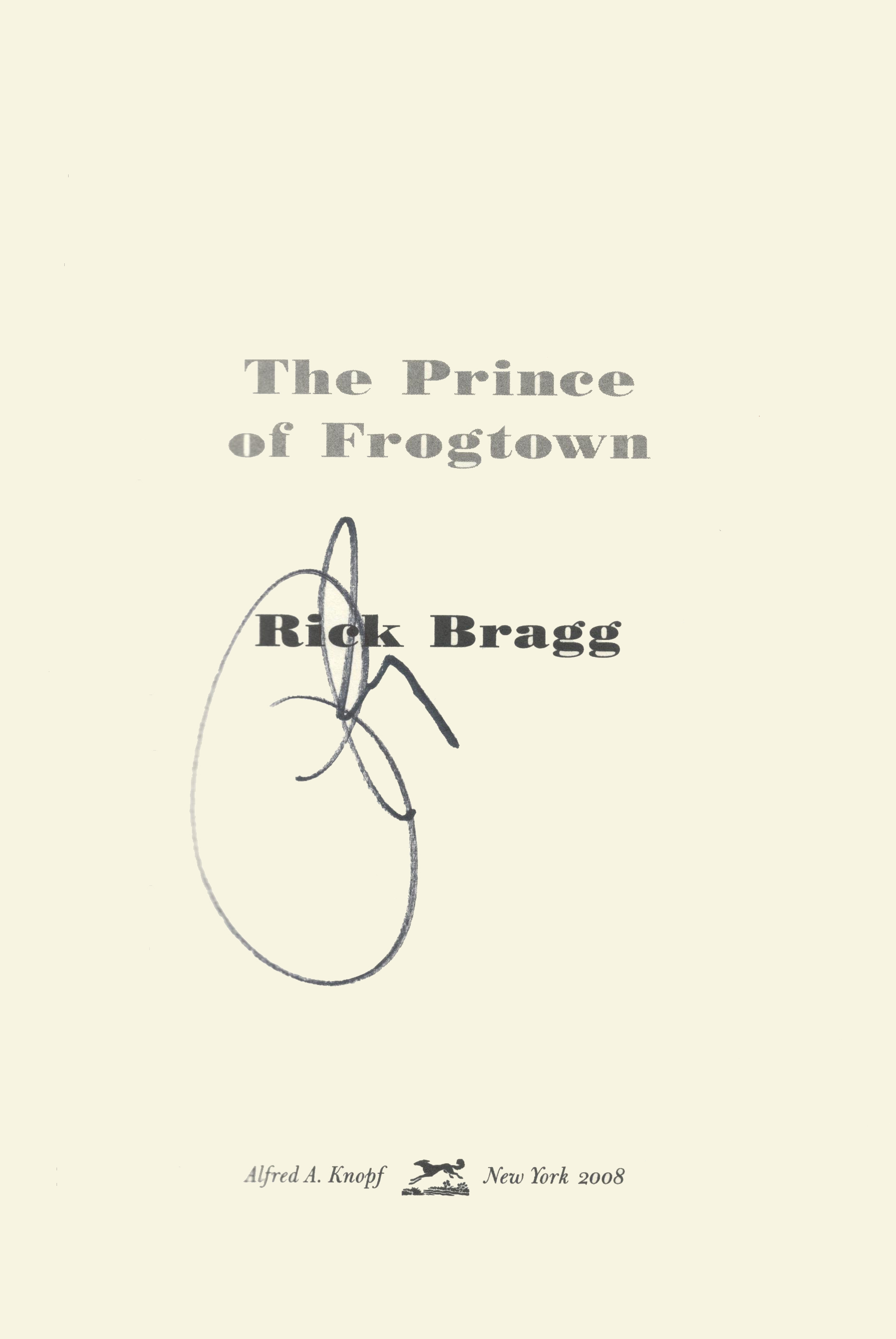 THE PRINCE OF FROGTOWN is the third and final volume in Rick Bragg's family trilogy that includes All Over but the Shoutin' and Ava's Man. The storyline has a focus on Rick's remembrances of his father, and his interviews with those who knew him, as well as his relationship with his step-son.