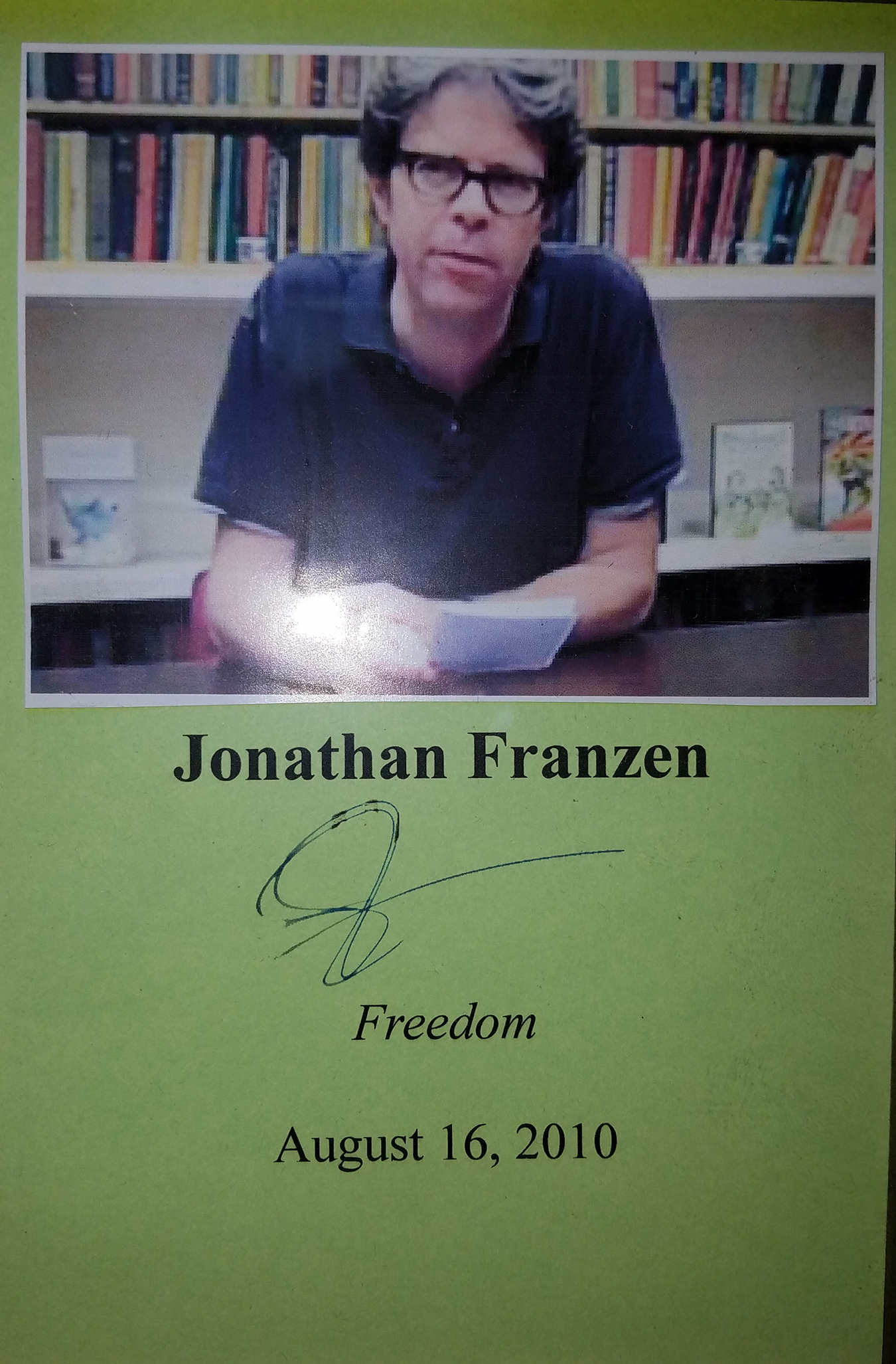 JOATHAN FRANZEN (pictured below from our Wall of Fame) won the National Book Award and was a finalist for the Pulitzer Prize. He is one of the few American novelists ever to appear on the cover of Time Magazine. That respected publication called him a genius and one of the great writers of our generation. The New York Times credited him with writing the best book of the year. Thank you Jonathan Franzen for signing our books.