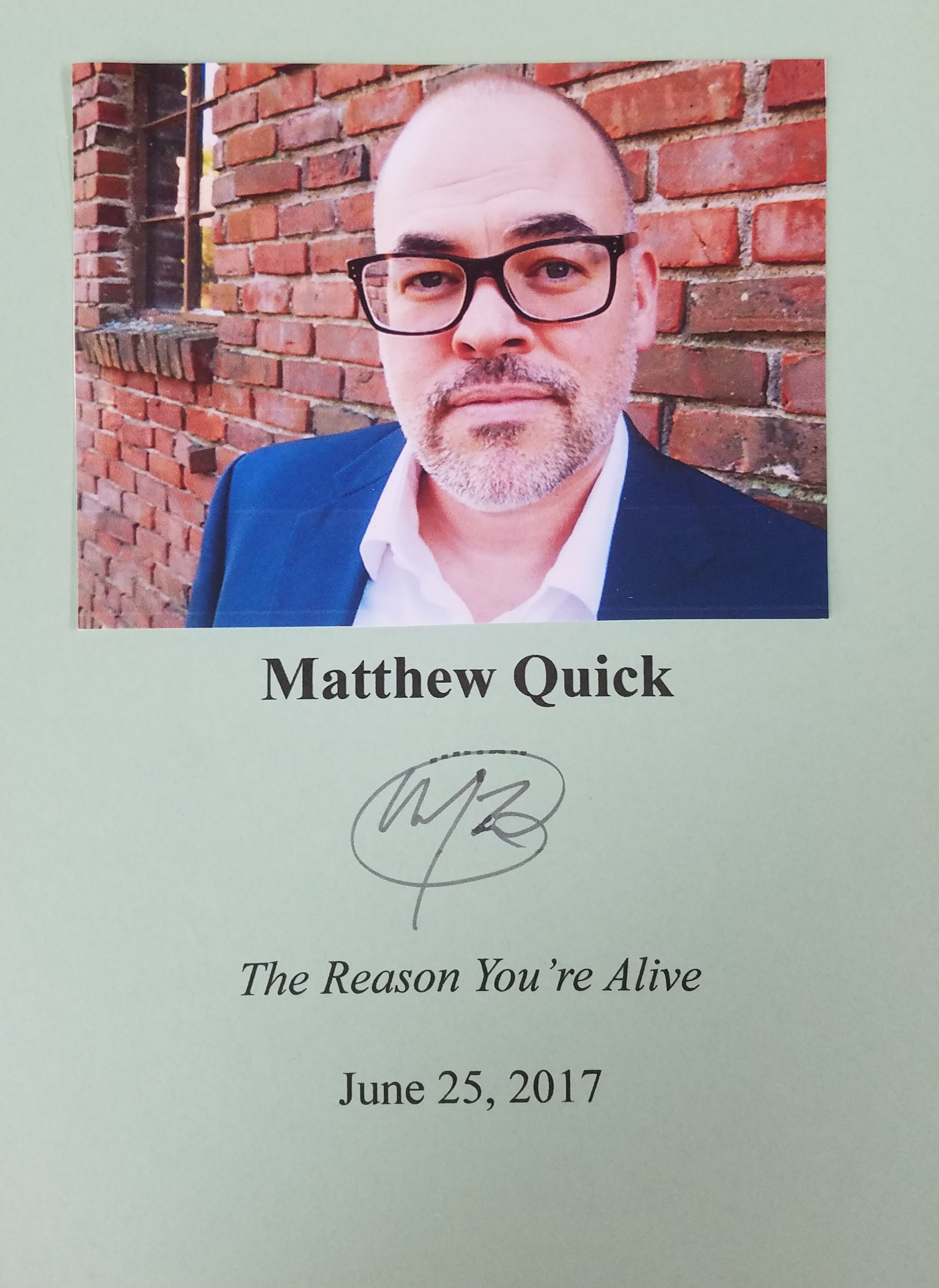 MATTHEW QUICK (pictured below from our Wall of Fame) is a worldwide best-selling author whose works have been translated into thirty languages. Every book he has written has been optioned for the movies, and The Silver Linings Playbook has already been adapted. Thank you Matthew Quick for signing our books.