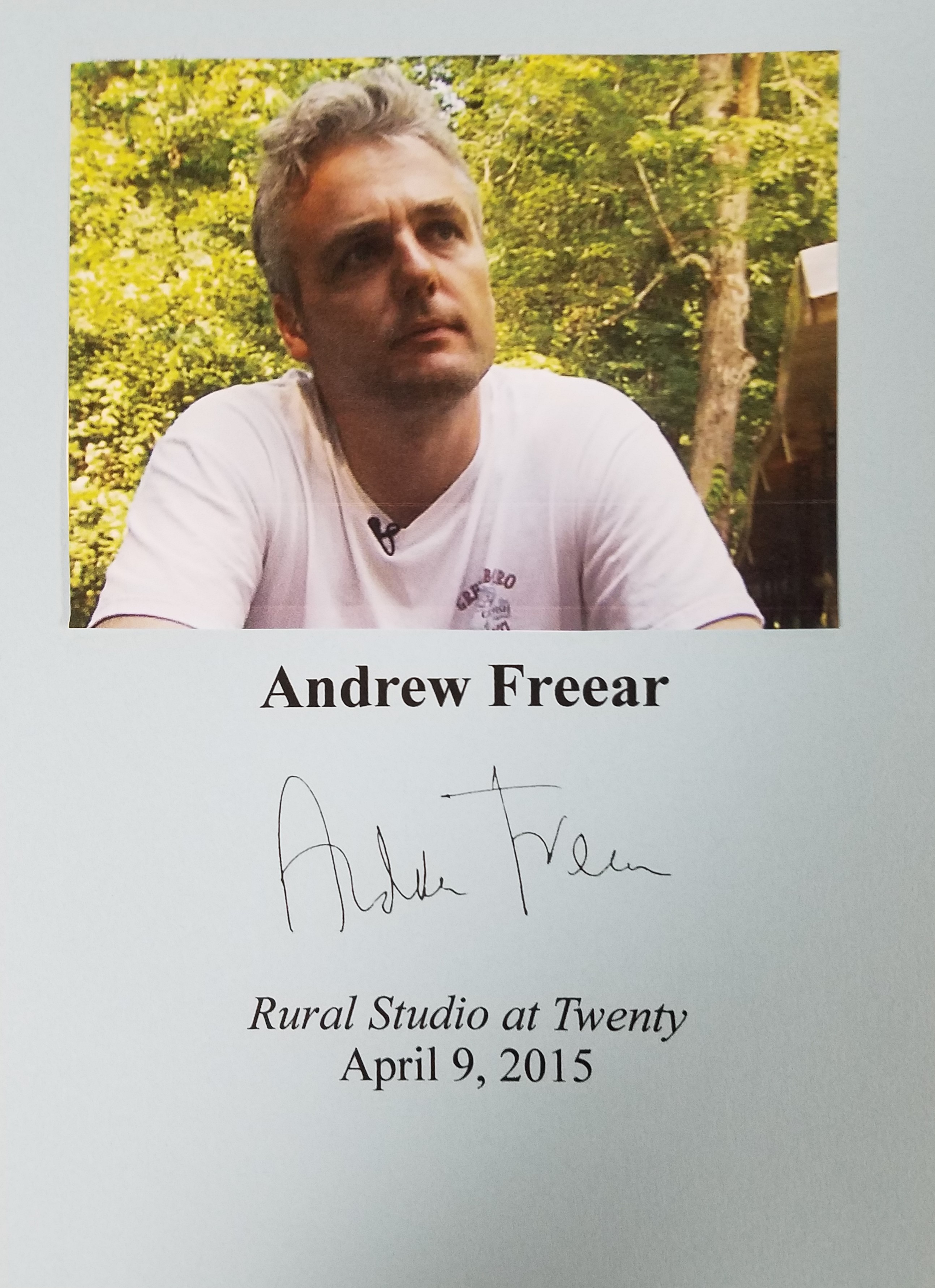 ANDREW FREEAR (pictured below from our Wall of Fame) is a professor at Auburn University and the director of the Rural Studio. Thank you Andrew Freear for signing our books.