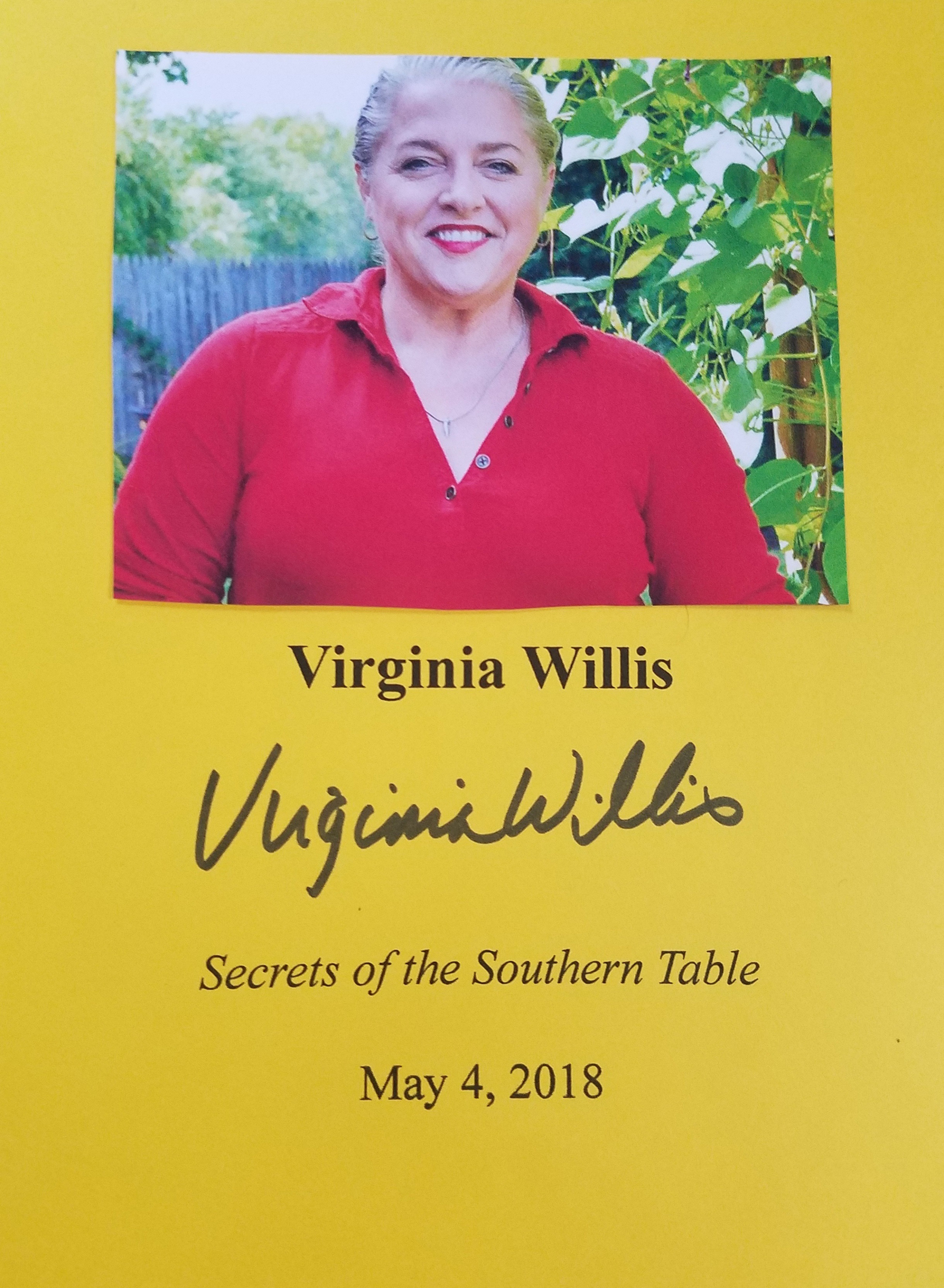 VIRGINIA WILLIS (pictured below from our Wall of Fame) is an editor-at-large for Southern Living and garnered a James Beard Award for her cookbook Lighten Up, Y'all. Her work has also appeared in Country Living, House Beautiful, and USA Today. Thank you Virginia Willis for signing our books.