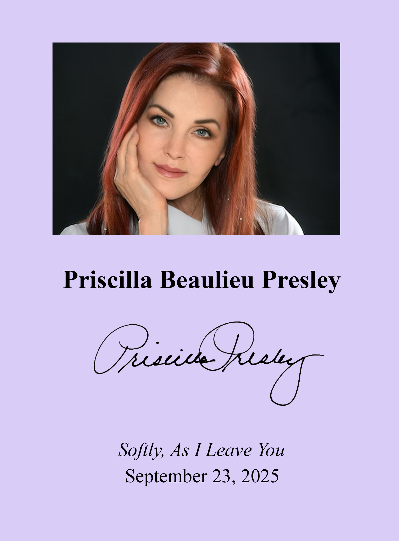 THIS COPY (shown below) was hand signed by Priscilla Presley on a page bound into the book. It is a new, unread, unopened first edition hardback and comes with a certificate authenticating the signature. Published in September, 2025 by Grand Central, an imprint of The Hachette Book Group.