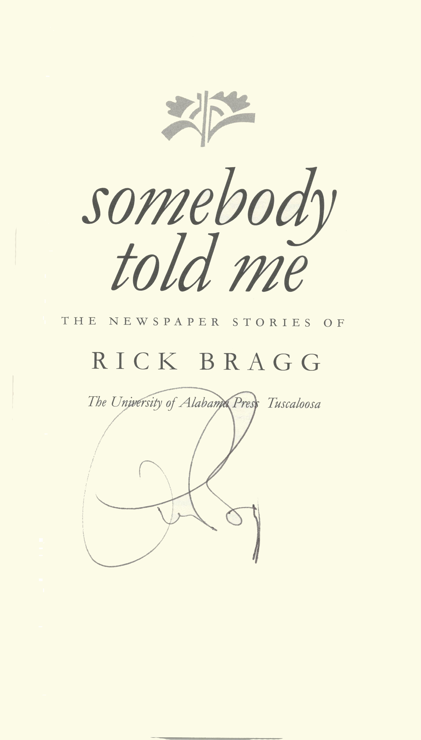 SOMEBODY TOLD ME is a collection of Pulitzer Prize winner Rick Bragg's best stories. He looks where others don't and gets behind the headlines to the people standing there stunned and often, he finds them, voiceless.