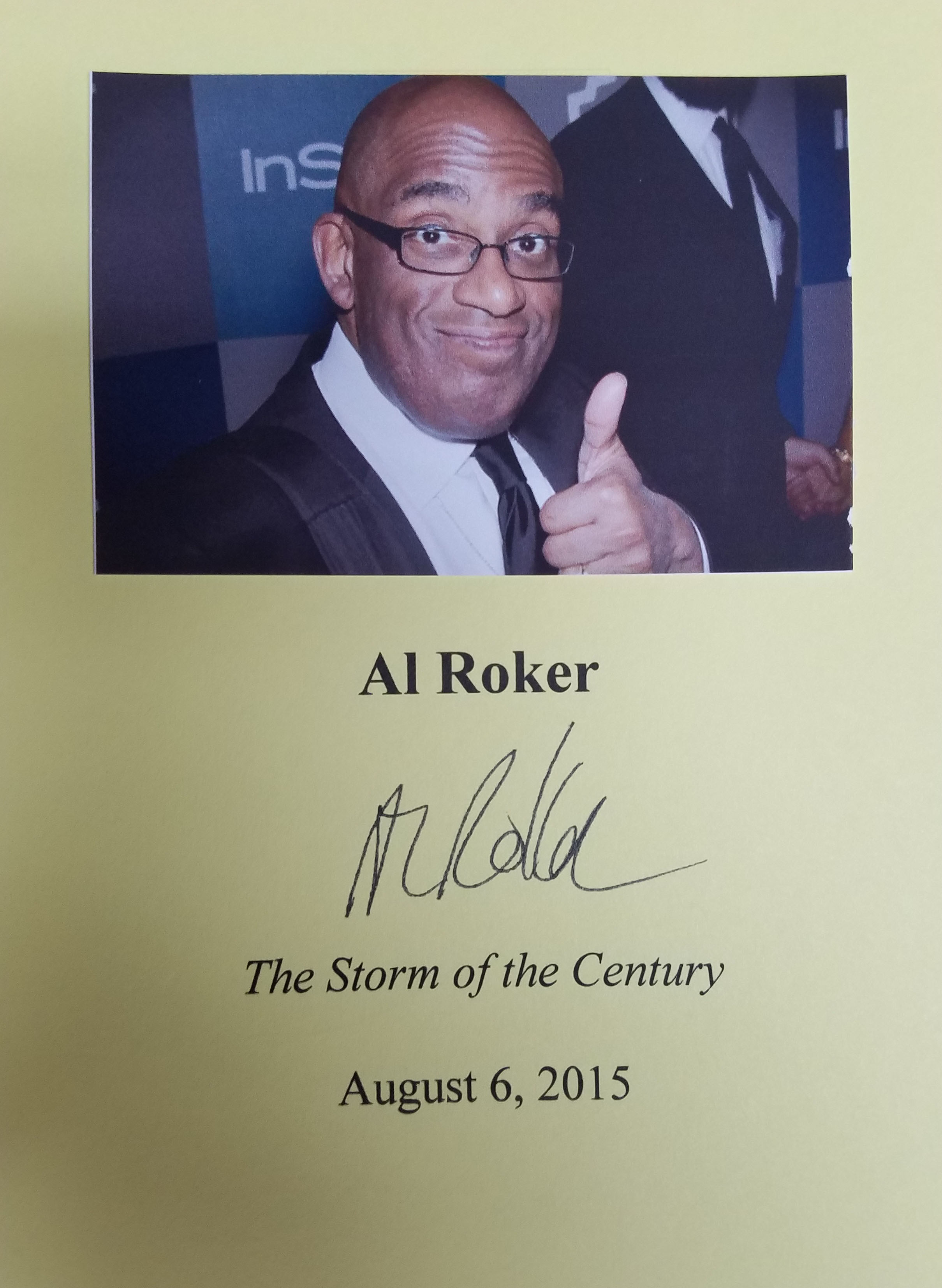 THIS COPY (shown below) was hand signed on the title page by Al Roker at his office. It is a new, unread first edition opened only for signing and comes with a certificate authenticating the signature. Published in August, 2015 by William Morrow, an imprint of HarperCollins.