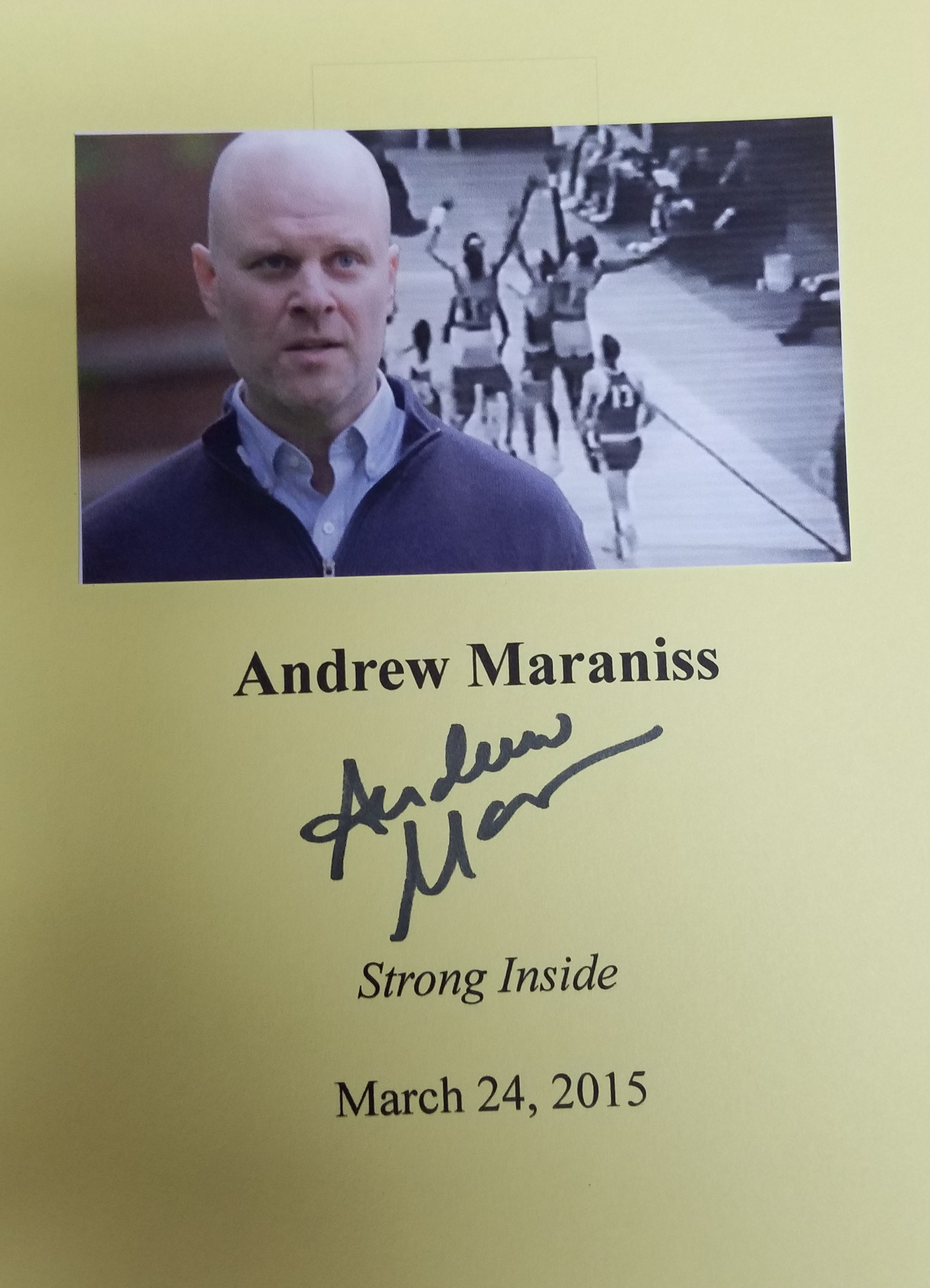 ANDREW MARANISS (pictured below from our Wall of Fame) is the son of a Pulitzer Prize winning author who has brought home a boatload of awards for his first book. Thank you Andrew Maraniss for signing our books.