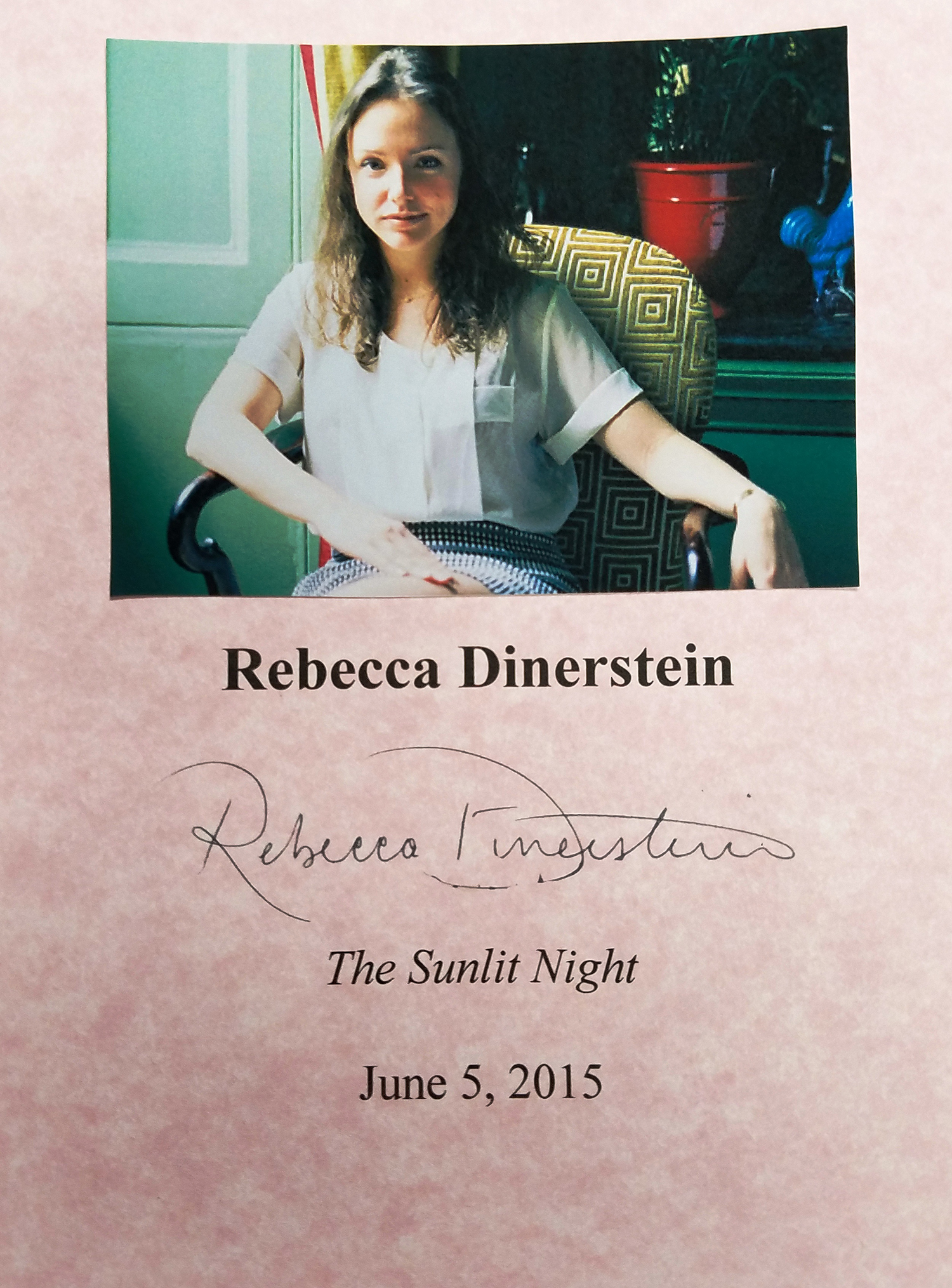 REBECCA DINERSTEIN (pictured below from our Wall of Fame) has been called America's newest literary sensation and her debut novel, The Sunlit Night was met with a mad bidding war. She wrote the book while spending much of her time alone ninety-five miles above the Arctic Circle. Thank you Rebecca Dinerstein for signing our books.