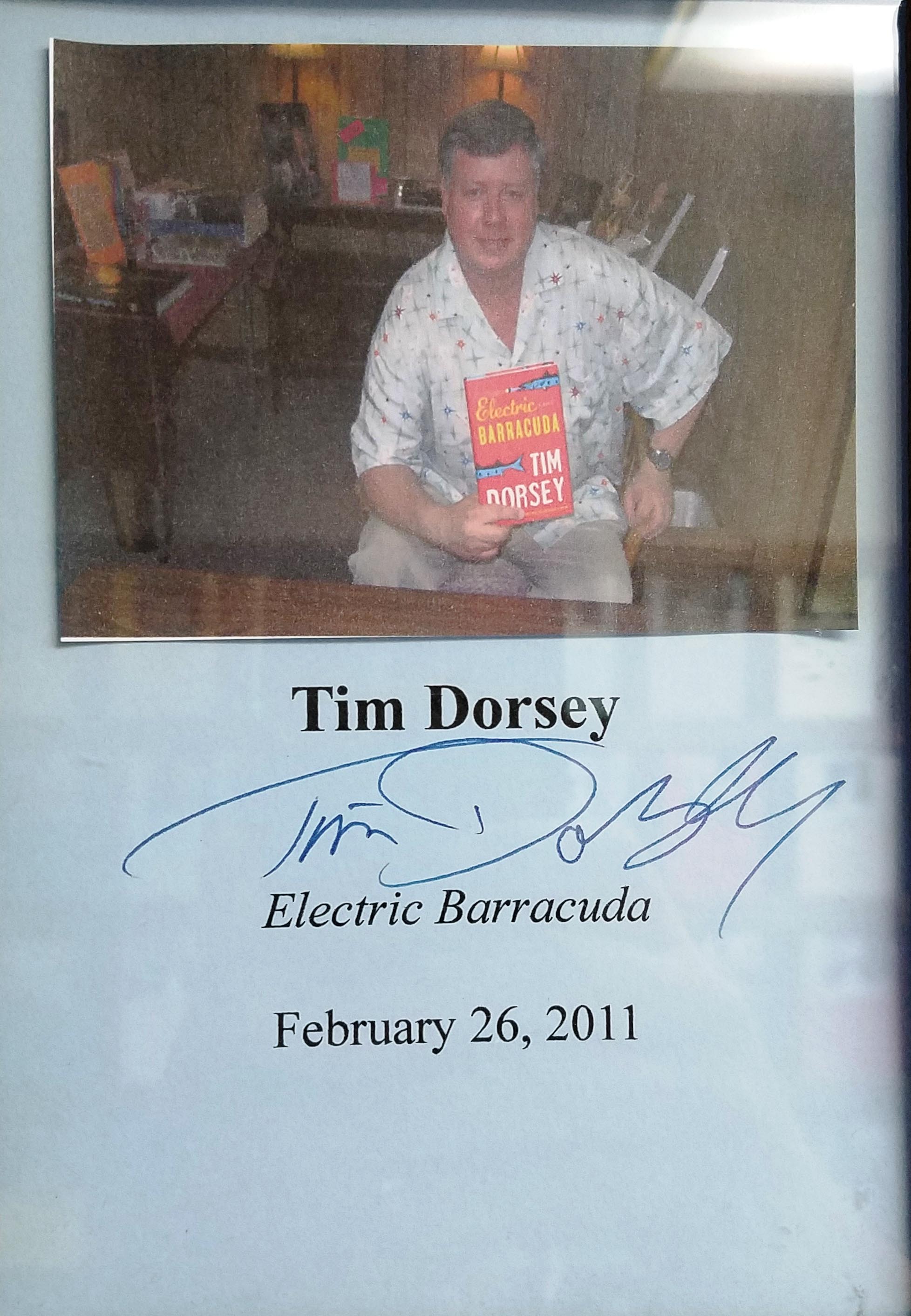 TIM DORSEY (pictured below from our Wall of Fame) is mentioned along with Dave Barry and Carl Hiaasen as the Three Musketeers of Florida humor writers. His tongue-in-cheek Sunshine State books have become best sellers throughout the South. He was editor of the Auburn Plainsman, which made him popular with exactly half the readers in Alabama. Thank you Tim Dorsey for signing our books and R.I.P.