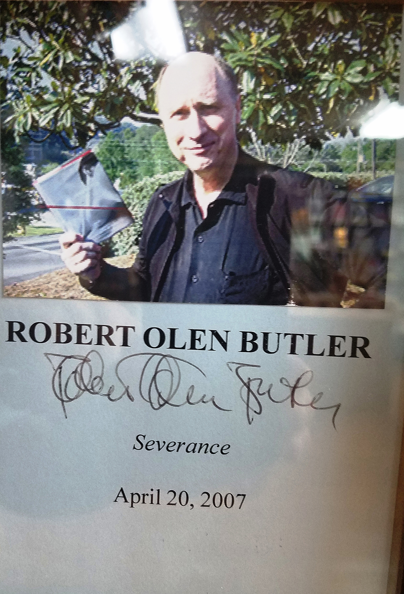 ROBERT OLEN BUTLER (pictured below from our Wall of Fame) and The Alabama Booksmith have a great relationship. Not just because the Pulitzer Prize winner is one of the great literary minds of this generation, nor because he launches every book tour at our store, not even because he acknowledged us in one of his books and actually wrote part of it here. At his launch a while back, he stole one of our booksellers, and married her. Thank you Robert Olen Butler for signing our books.