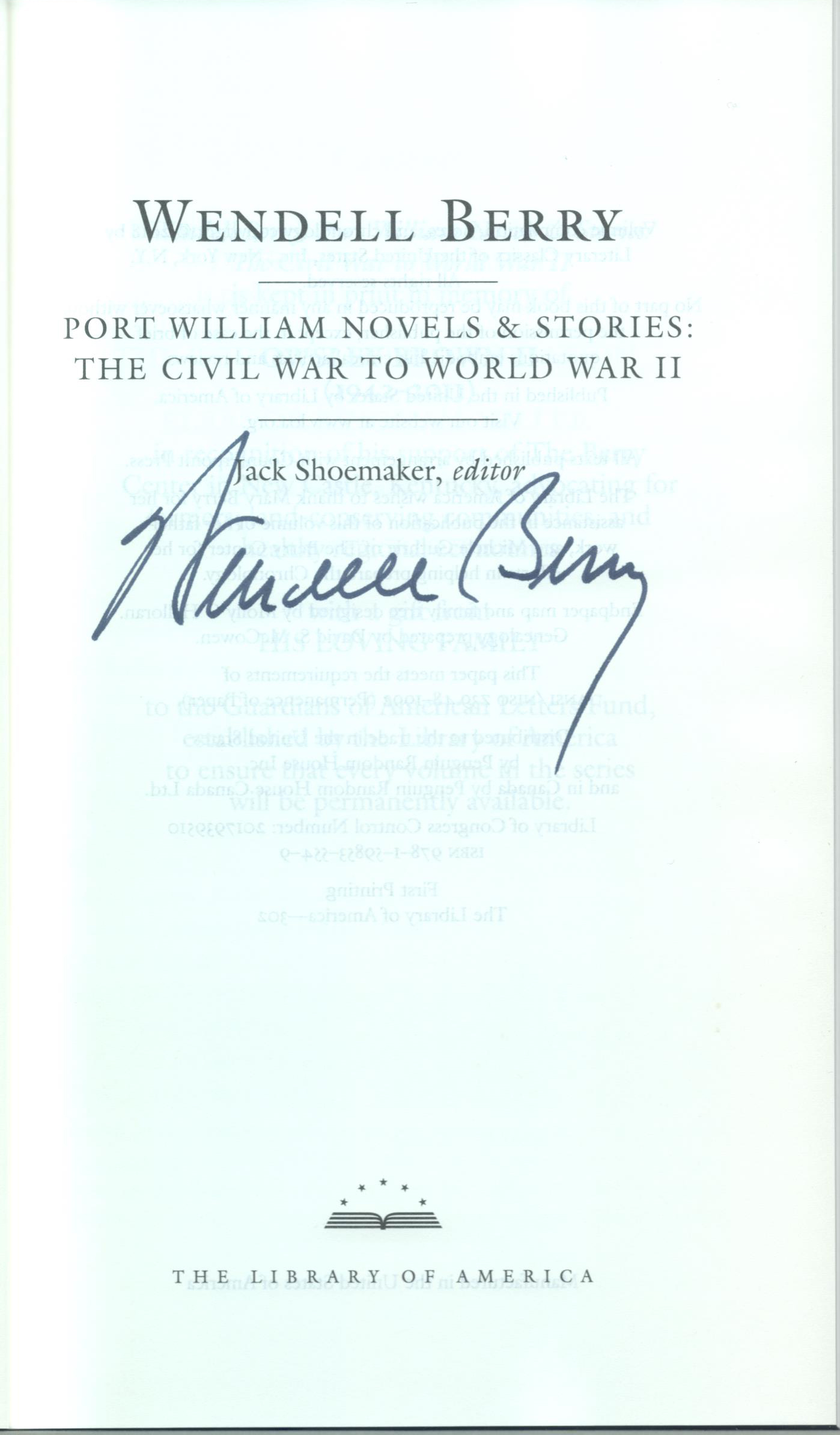 THIS COPY (shown below) is hand signed by Wendell Berry on the title page. It is a new, unread first edition opened only for signing and comes with a certificate authenticating the signature. Published in January, 2018 by the Library of America, an imprint of Penguin Random House.