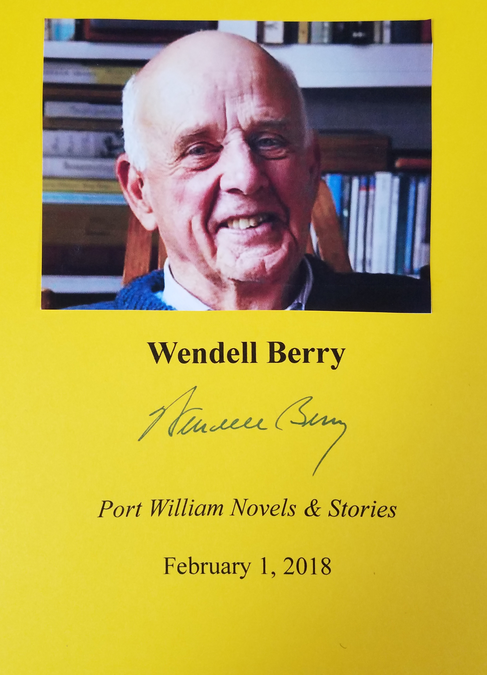 WENDELL BERRY (pictured below from our Wall of Fame) is the nation's voice for protecting the planet, and has received a boatload of awards for his writing and activism. His honors include the Presidential Humanities Medal and the National Book Critics Circle Lifetime Achievement Award. He has written more than 60 books of essays, poetry and fiction. His work, penned in longhand from his Kentucky farm, portrays an intimate picture of the mind and heart of rural America. Thank you for signing our books.