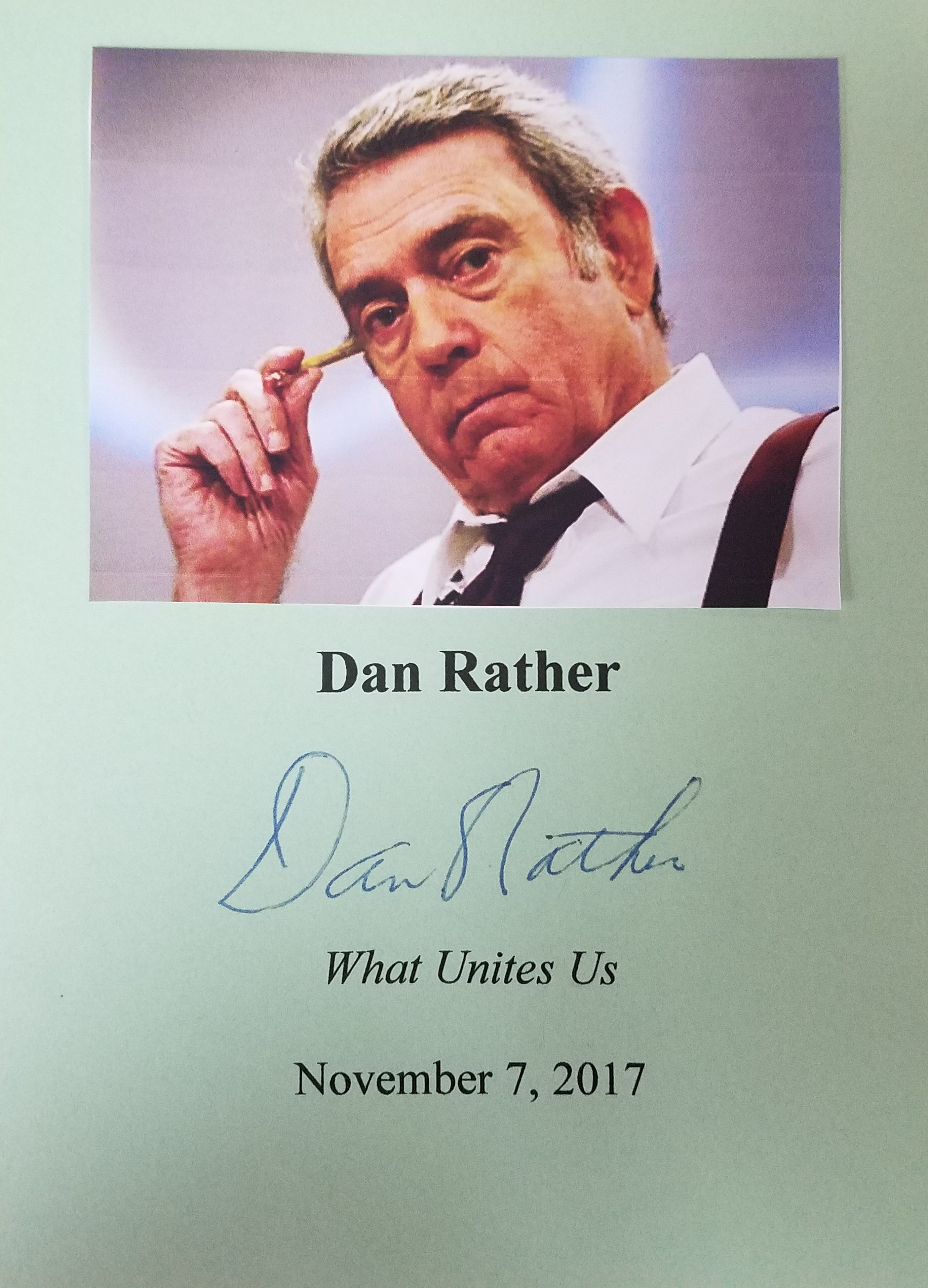 DAN RATHER (pictured below from our Wall of Fame) is one of the world's best-known journalists. He has interviewed every president since Eisenhower and covered almost every major event around the world for almost six decades. Thank you Dan Rather for signing our books.