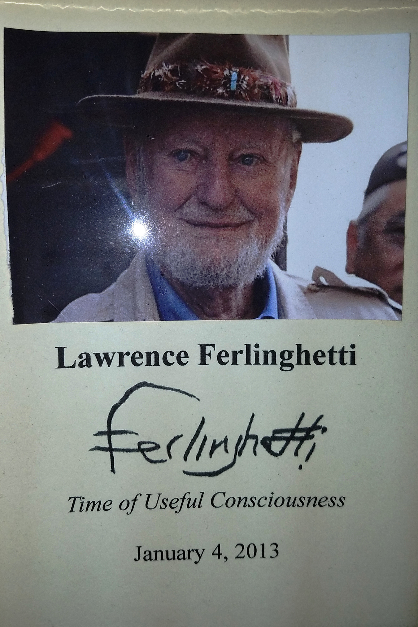 LAWRENCE FERLINGHETTI (pictured below from our Wall of Fame) was the literary face of the twentieth and the twenty-first century. He co-founded the world-famous City Lights bookstore in San Francisco and published such greats as Allen Ginsburg, William Carlos Williams, William S. Burroughs, Charles Bukowski and many more. His own writings have been translated into nine languages and sold more than a million copies. Prior to becoming the giant of our industry, he was a sub chaser commander in World War Two and participated in the D-Day invasion. He studied his craft in this country and abroad and holds a doctorate. He was still going strong when passed his 101st birthday. He will be remembered forever. Thank you Lawrence Ferlinghetti for signing our books. R.I.P.