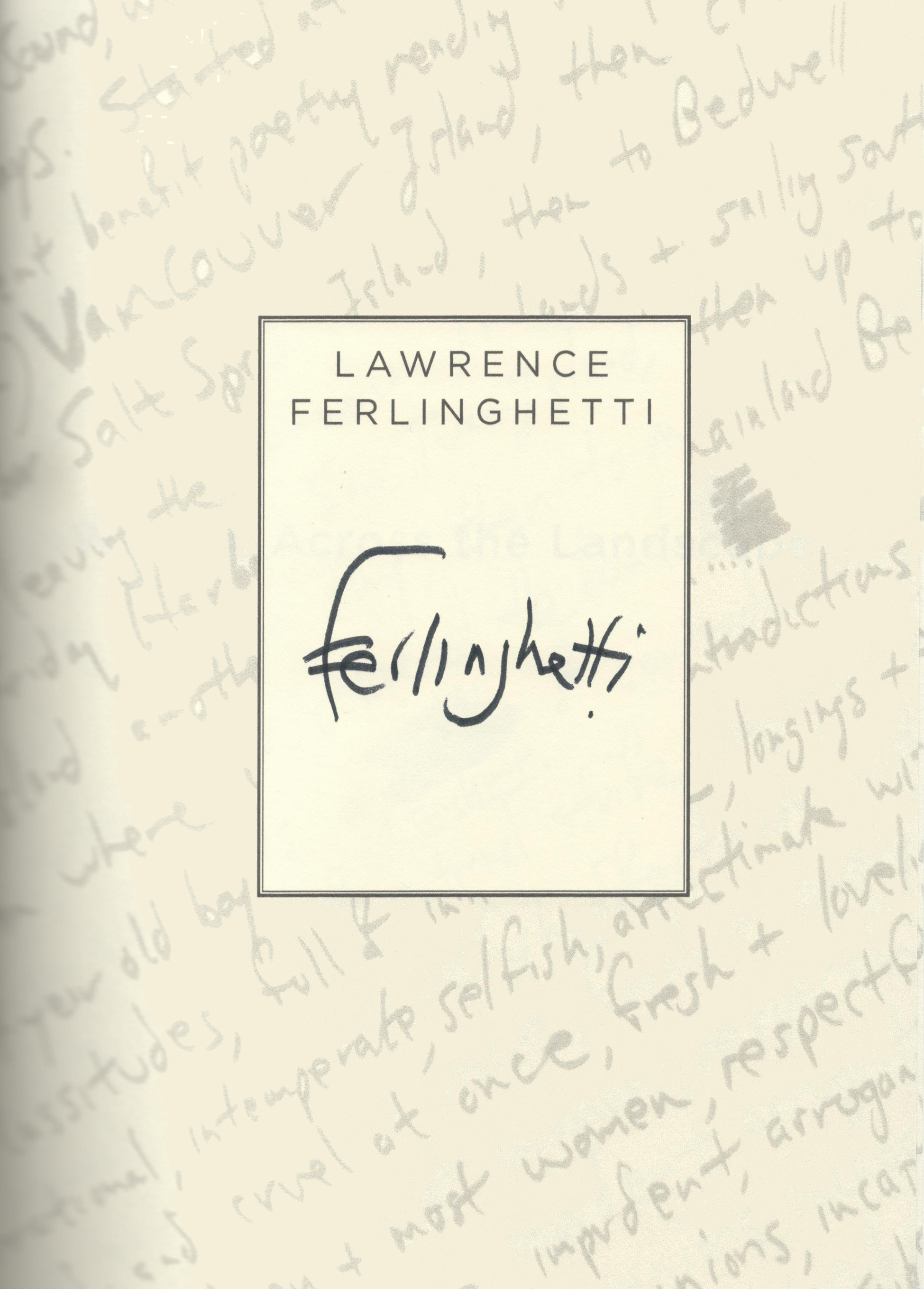 THIS COPY (shown below) was hand signed by Lawrence Ferlinghetti at his office on a page that was bound into the book. It is a new, unopened first edition and comes with a certificate authenticating the signature. Published in September, 2015 by Liverlight, an imprint of W.W. Norton.